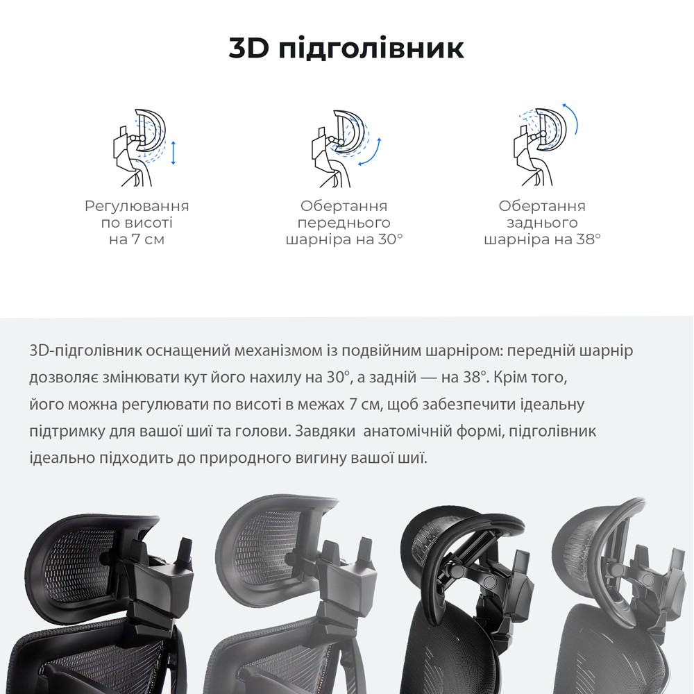 - 3D-подголовник: анатомическая форма, регулировка угла наклона (30°/38°) и высоты (до 7 см) обеспечивают идеальную поддержку шеи.