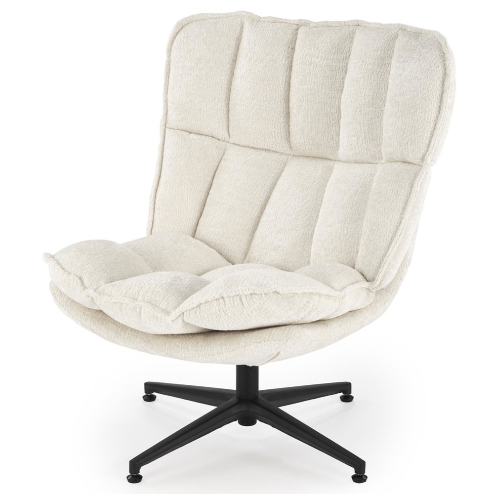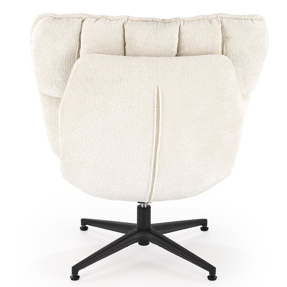 Обивка из нежной ткани в кремовом оттенке придает креслу утонченный и универсальный вид, а также делает его приятным на ощупь и легким в уходе. Прочная стальная основа с порошковым покрытием гарантирует устойчивость конструкции и долговечность, а также создаёт стильный контраст с мягким текстилем.