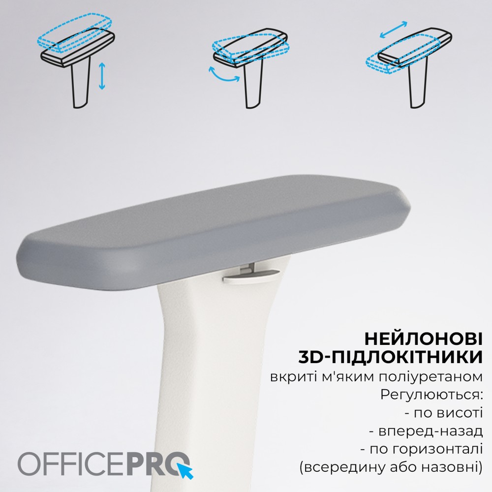 - 3D-подлокотники с мягким покрытием регулируются в трех направлениях: по высоте, глубине и углу разворота.