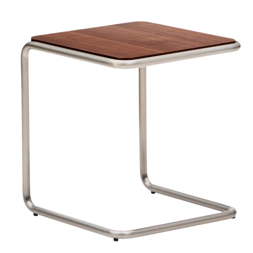 Столешница выполнена из орехового шпона толщиной 0,6 мм с темной отделкой, придающей поверхности глубину и тепло. Она эффектно контрастирует с трубчатой конструкцией из нержавеющей стали с матовой шлифовкой, которая уменьшает видимость отпечатков пальцев и подчеркивает современный характер изделия.