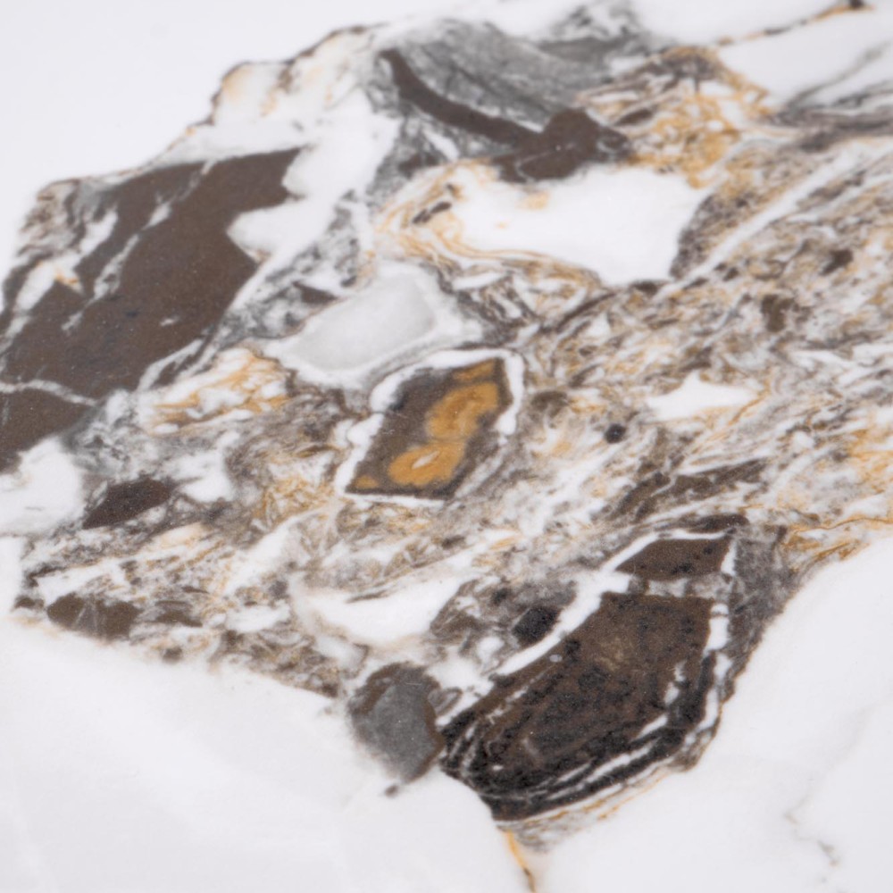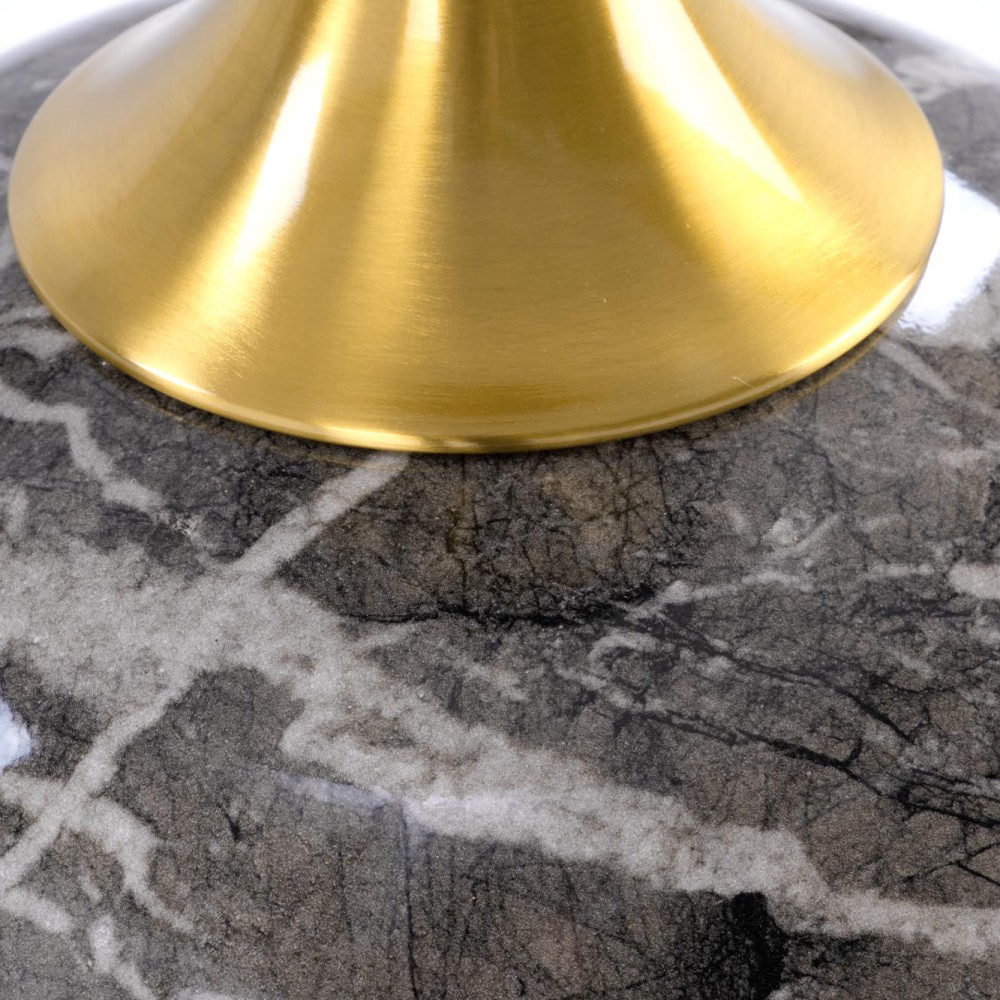 Визуальную эстетику модели дополняет золотистая вставка из нержавеющей стали, соединяющая столешницу с основанием. Этот деликатный акцент придаёт столу утончённую нотку гламура и подчёркивает его премиальный характер. Контраст прохладного мрамора и тёплого металлика создаёт гармоничную и запоминающуюся композицию.