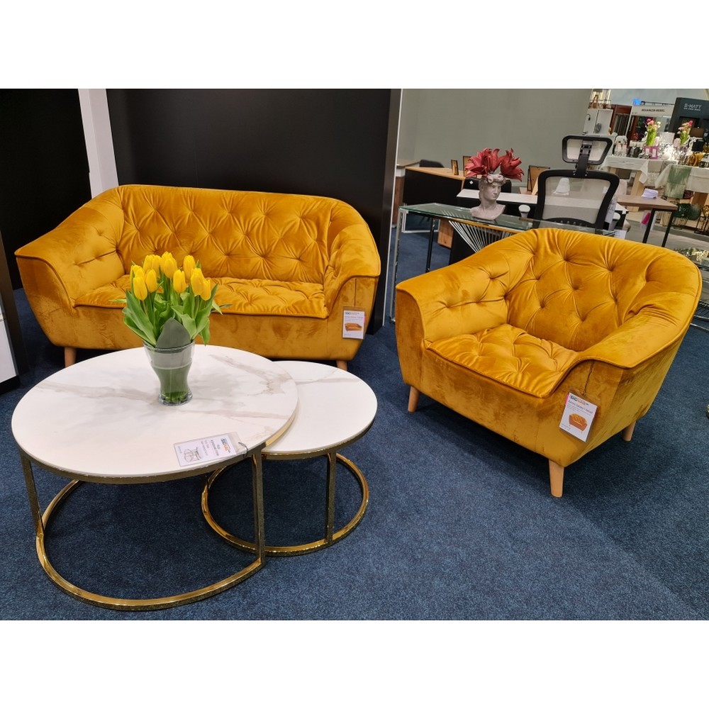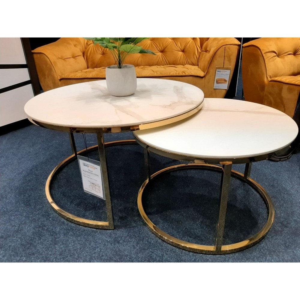 Изысканный журнальный стол Muse гармонично впишется в любую современную гостиную, пользуется огромным спросом среди покупателей. Необычный каркас стола выполнен из нержавеющей стали золотого цвета, две вместительные столешницы создаются из каленного стекла с эффектом мрамора. Стоит отметить, что консоль очень легко поддается очистке.