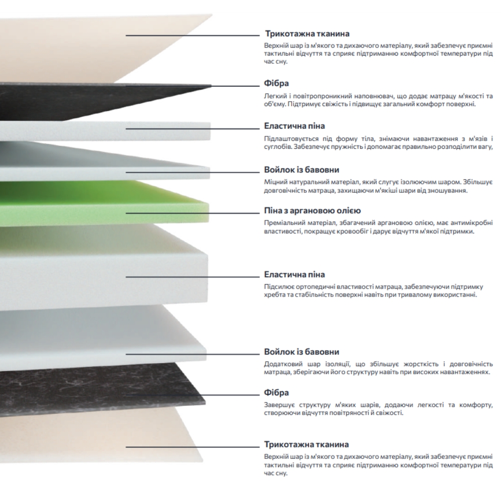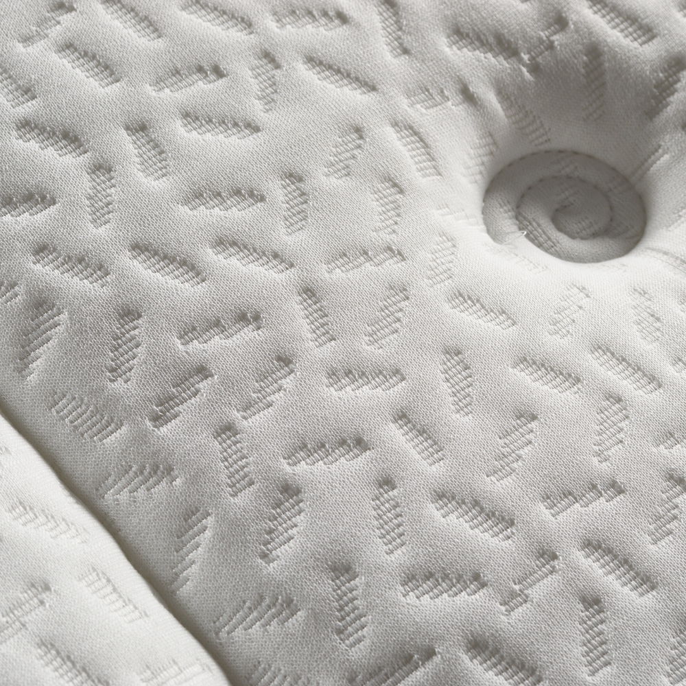 Матрас изготовлен из трикотажной ткани и фибры, что вместе с Crystal gel memory обеспечивает отличную циркуляцию воздуха. Это гарантирует свежесть и комфорт даже в жаркие летние ночи, снижая риск аллергических реакций.