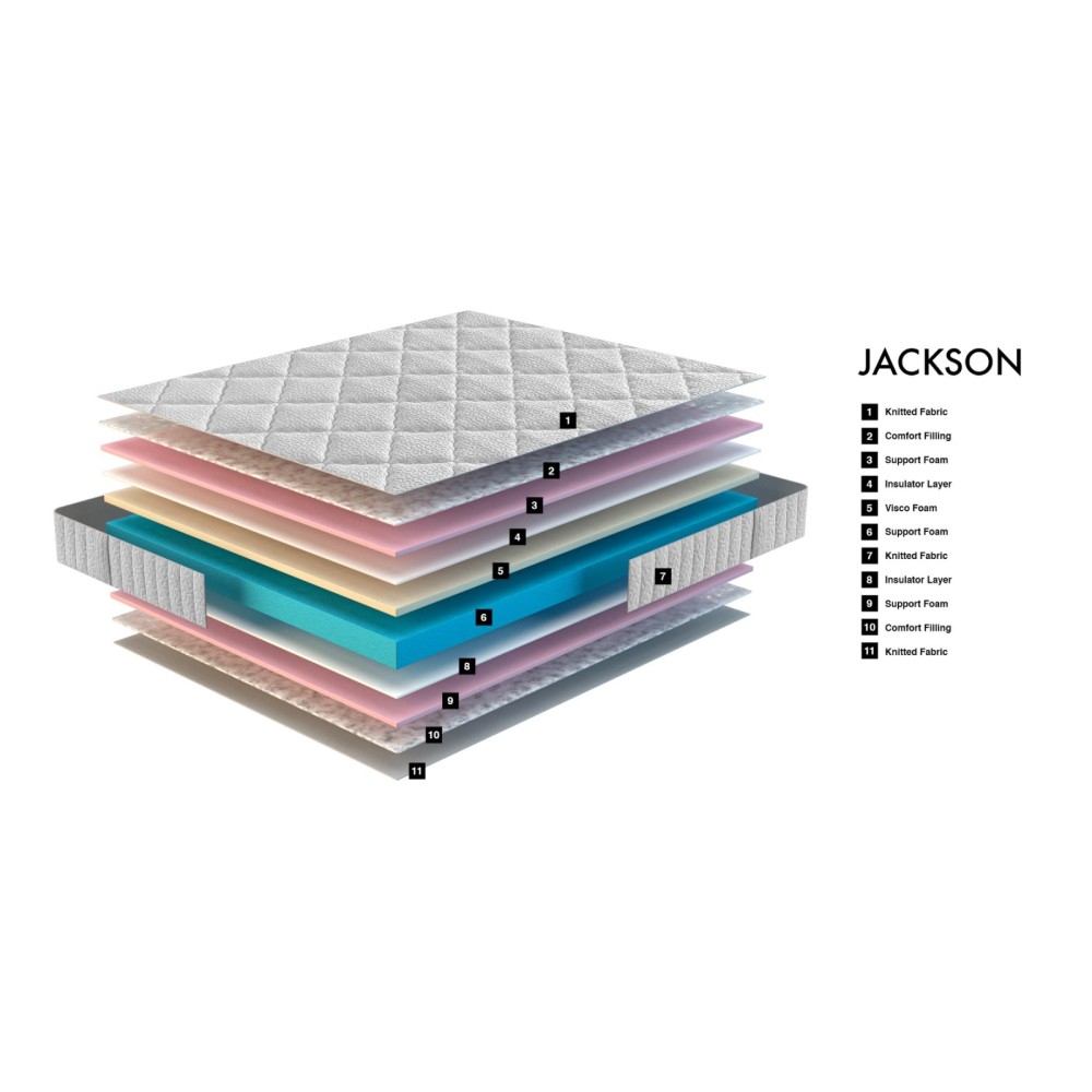 Jackson - ортопедический и анатомический матрас, который обеспечивает здоровый сон и правильное положение позвоночника во время отдыха. Беспружинный матрас имеет разностороннюю жесткость: на одной средняя, а на другой повышенная жесткость. Внутри располагается высокоэластичная пена с эффектом памяти, а чехол модели выполнен из износостойкого турецкого трикотажа.