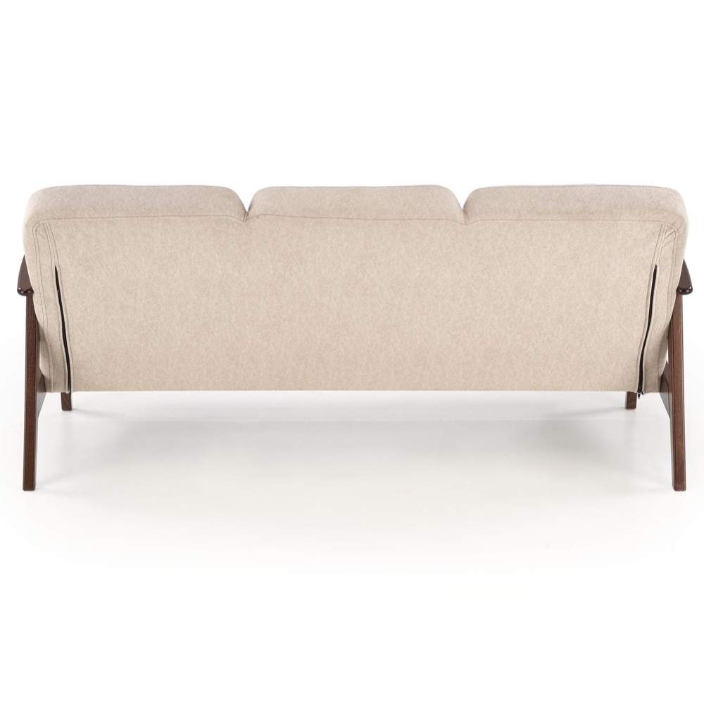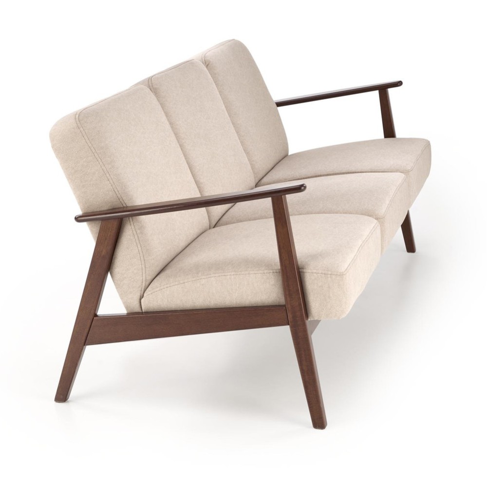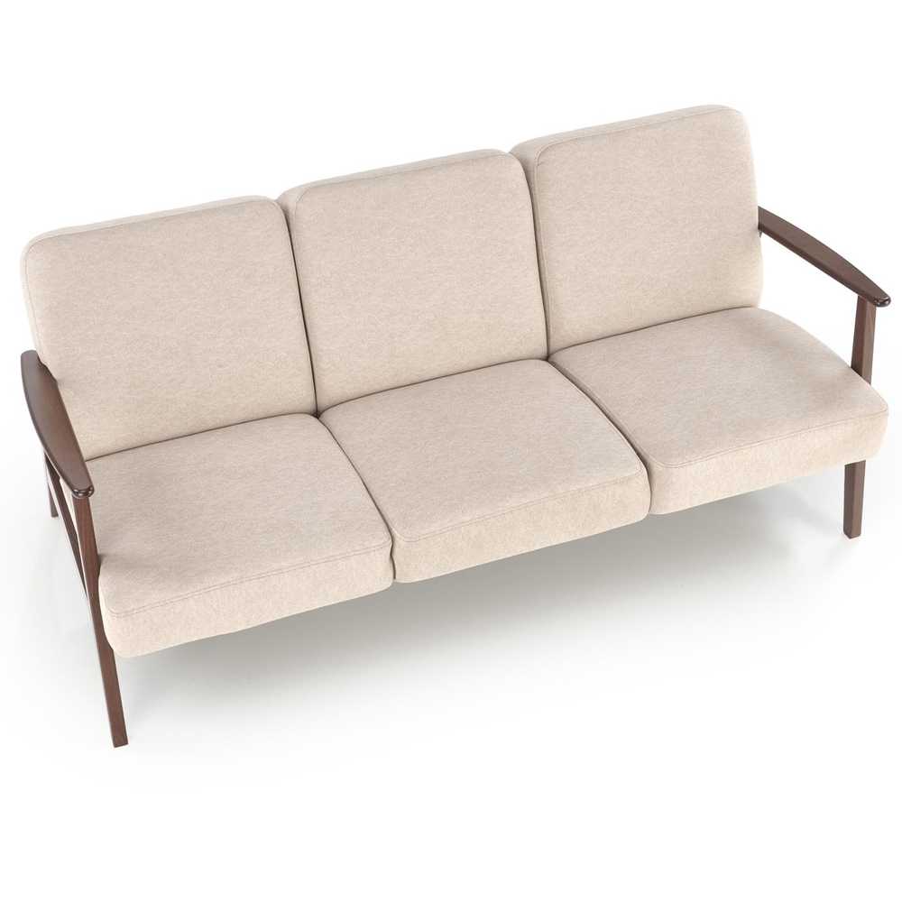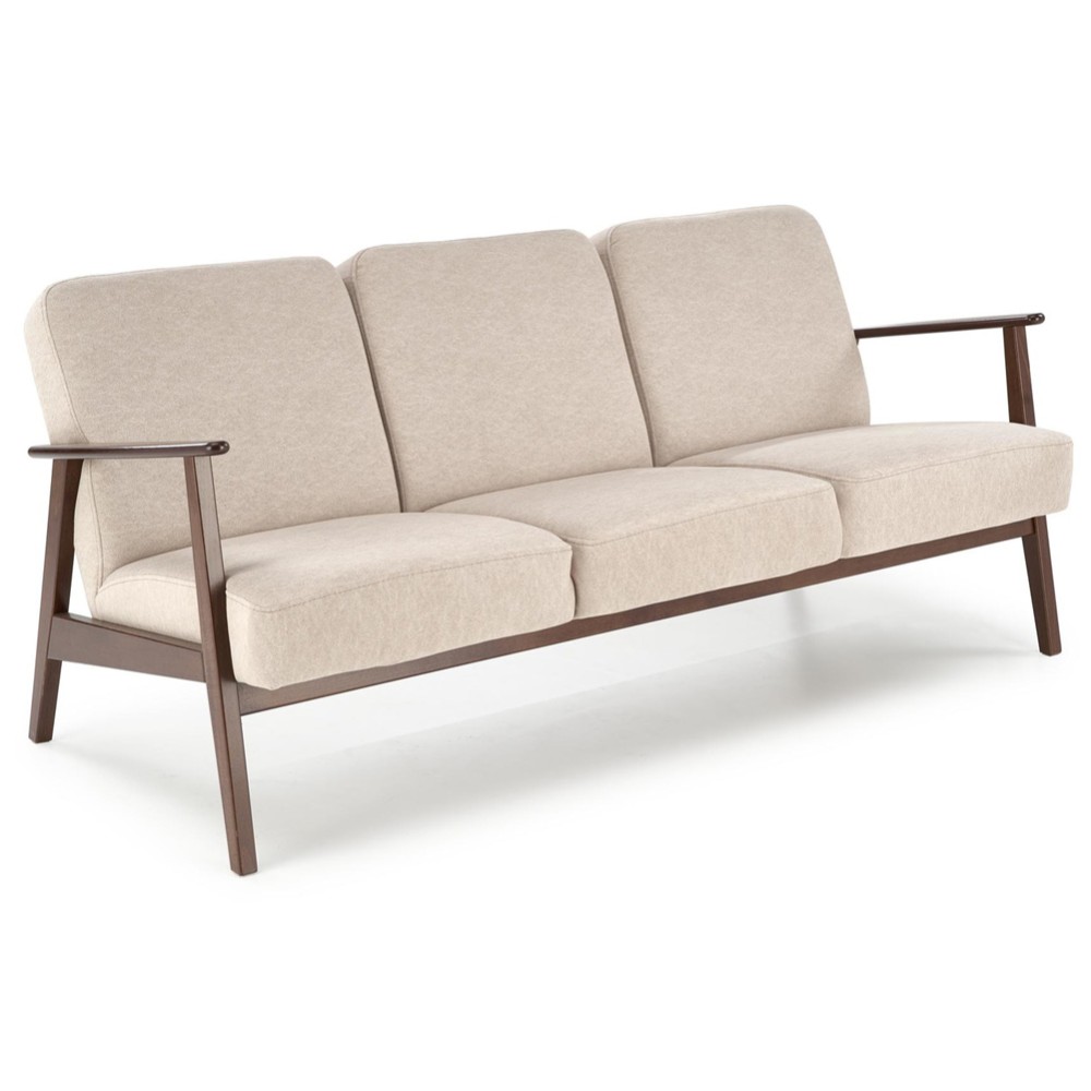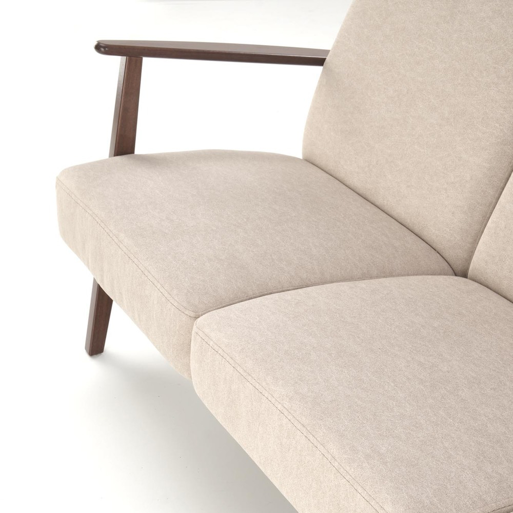 Обивка из ткани в бежевом оттенке создает мягкую, уютную атмосферу, при этом материал отличается износостойкостью и приятной текстурой. Каркас и подлокотники из массива бука в цвете темный орех обеспечивают долговечность, устойчивость и стильный винтажный акцент.