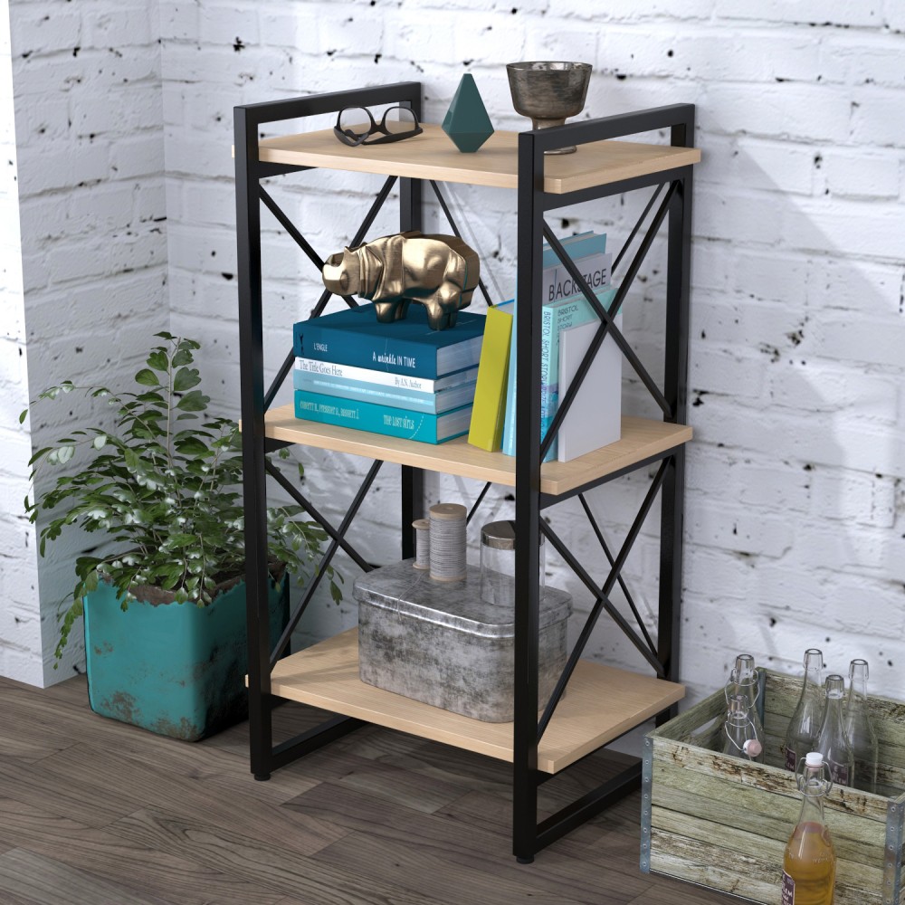 Изюминкой стеллажа являются крестообразные вставки, которые выполняют декоративную функцию, а также на них удобно опирать книги. Оригинальности изделию добавляет металлический каркас. Стеллаж достаточно устойчив из-за диагональный перемычек, которые находятся сзади. Регулируемые ножки позволяют без проблем разместить стеллаж на неровном полу. Процесс сборки займет у вас максимум 15 минут, а все что вам понадобиться входит в комплект.