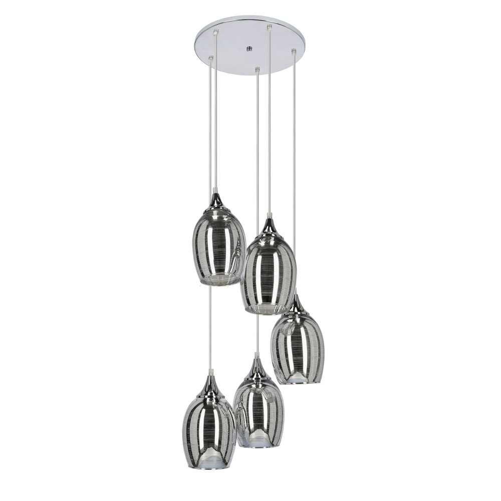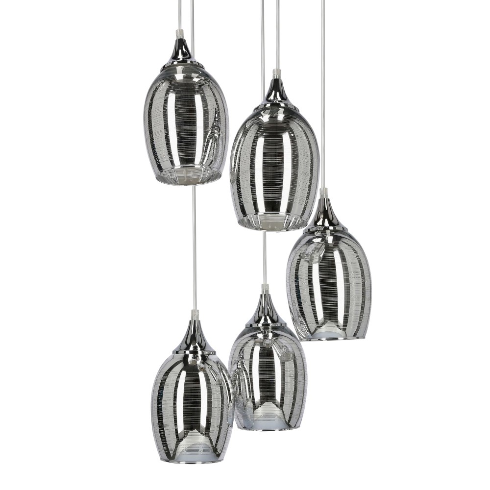 - Пять стеклянных плафонов с зеркальным хромированным покрытием мягко отражают свет, создавая атмосферу роскоши и тепла.