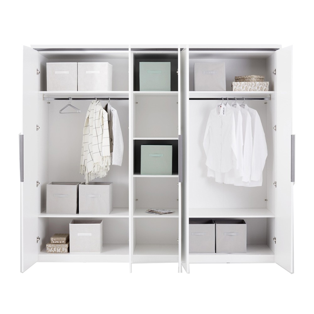 Вместительный шкаф 5-ти дверный Lucca - это находка именно для вашей спальни. В таком шкафу вы сможете разместить абсолютно весь гардероб и даже немного больше. За центральной дверью находится отделение с полками. Два боковых отсека внутри оборудованы штангами для вешалок и полками для хранения. Шкаф 5-ти дверный Lucca выполнен в спокойных белых тонах с акцентными линиями цвета "угля".