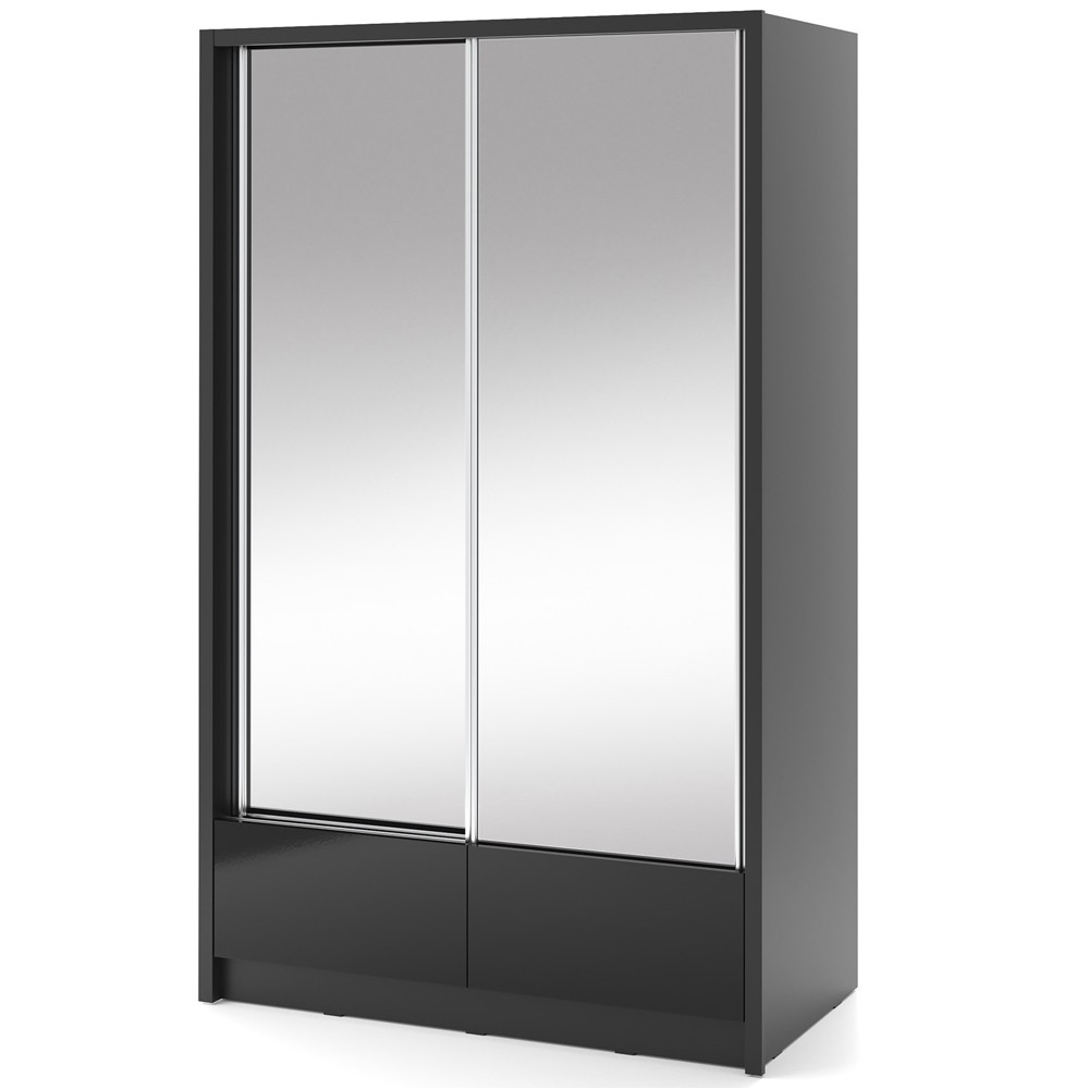 Шкаф-купе с двойным зеркалом и ящиками Aria II 130 несмотря на свои компактные размеры, излучает элегантность. Два встроенных зеркала на дверях выполняют важную функцию – они оптически увеличивают пространство комнаты. Кроме того, они являются удобными помощниками для быстрой коррекции прически или последнего прикосновения к наряду перед выходом на улицу.