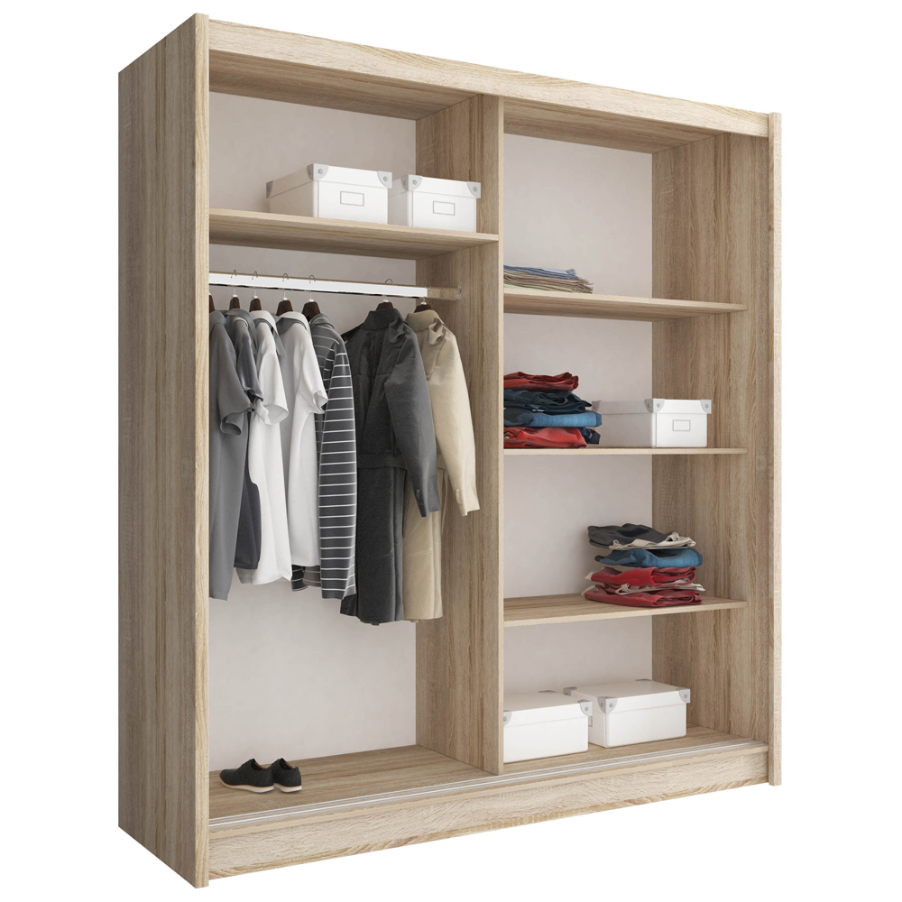 Внутреннее пространство шкафа оборудовано штангой для вешалок, удобными полками и просторными верхними отделениями. Это функциональное наполнение предназначено для организованного размещения верхней одежды, платьев, костюмов, а также для аккуратного хранения сложенных вещей, белья, обуви и различных аксессуаров.