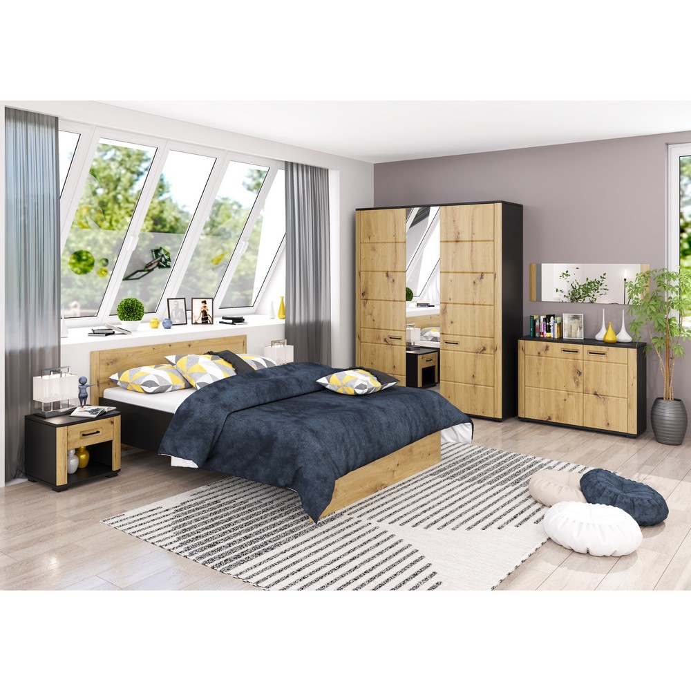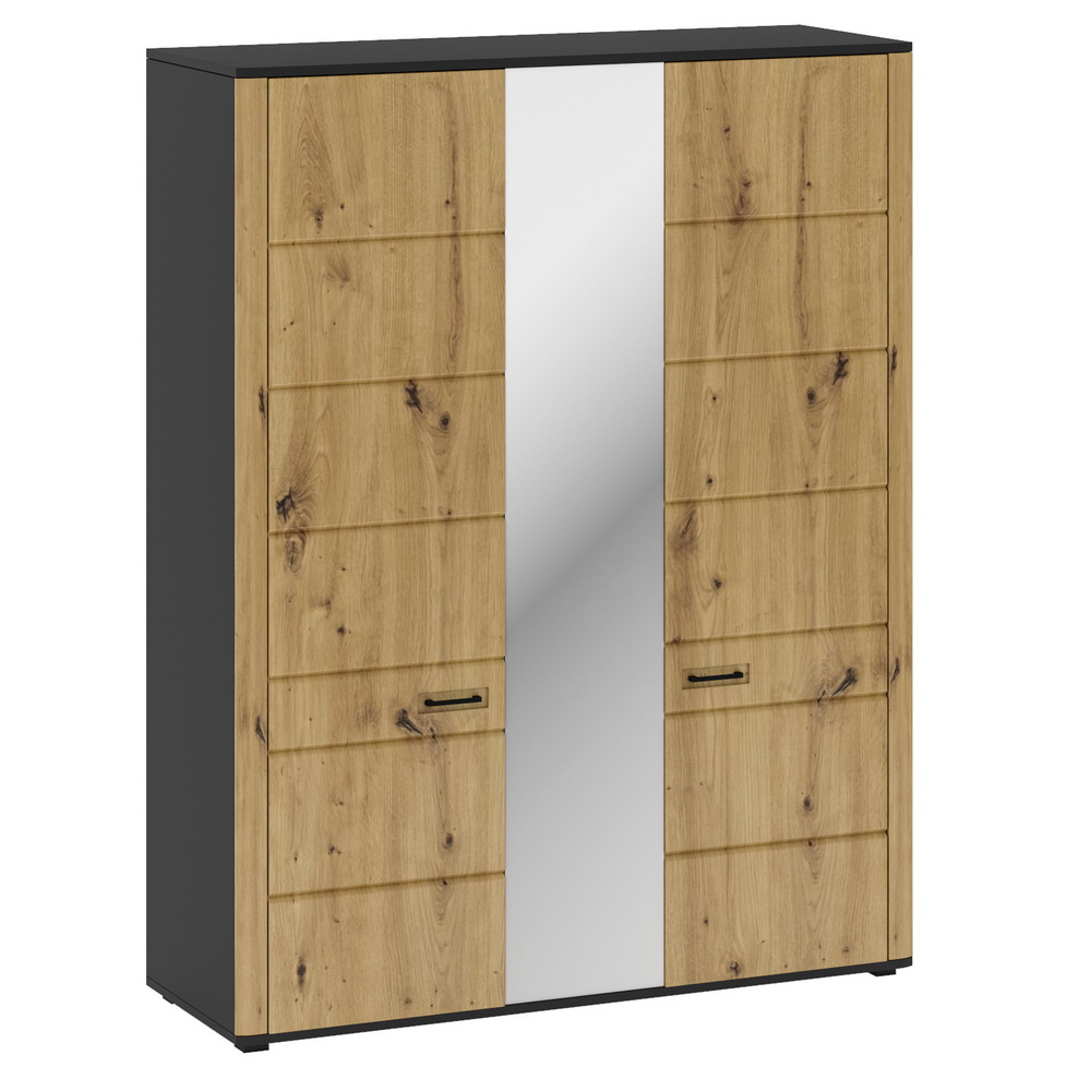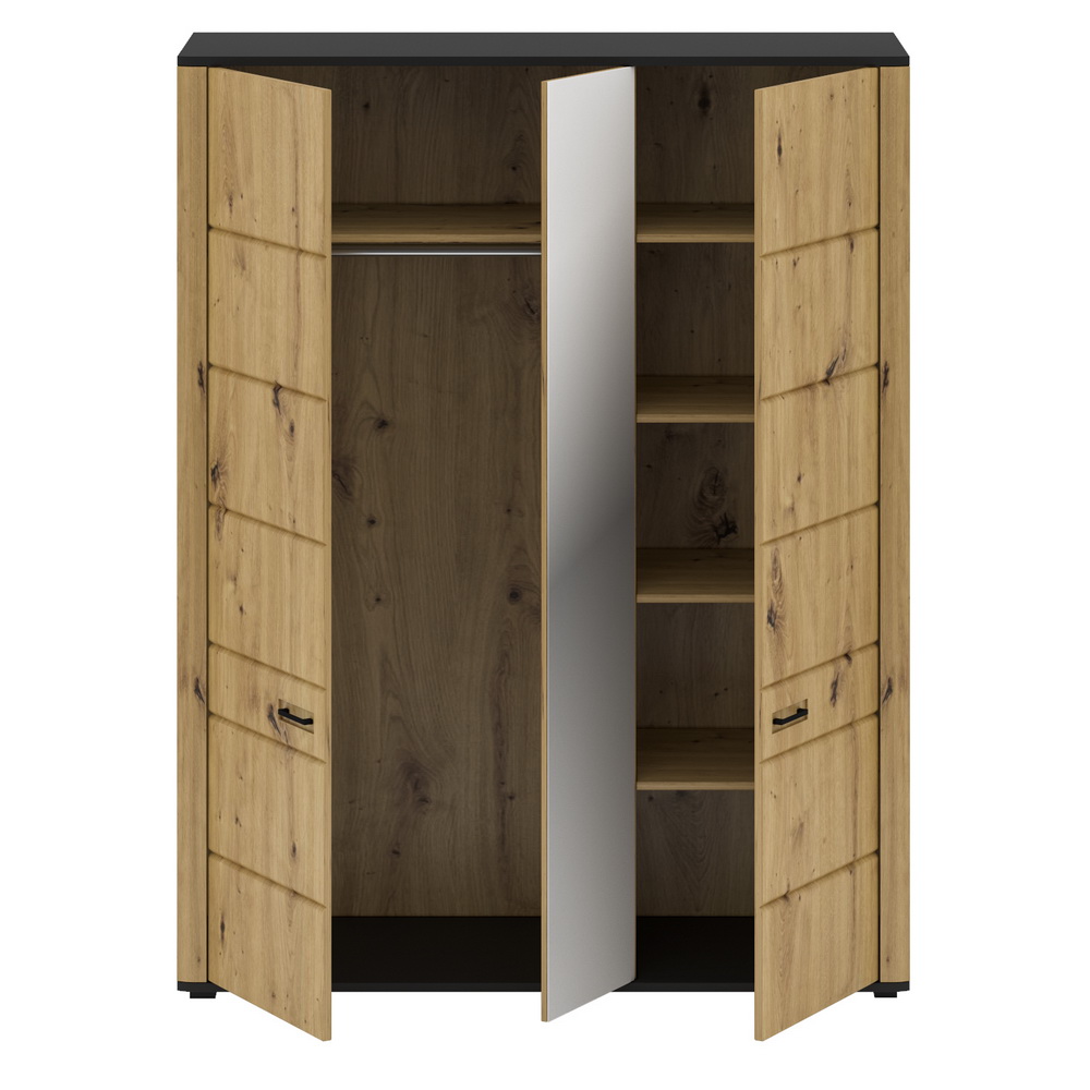 Практичный и стильный шкаф Martin M предназначен для установки в современной гостиной, рекомендуется покупать вместе с другой мебелью данной серии. Каркас модели изготовляется из качественного ДСП, для фасада используется покрытое матовой пленкой МДФ цвета дуб артизан. Гардероб оснащен тремя распашными дверками, одна из которых украшена большим зеркалом. Для хранения вещей производитель предусмотрел несколько полок и штангу для вешалок.