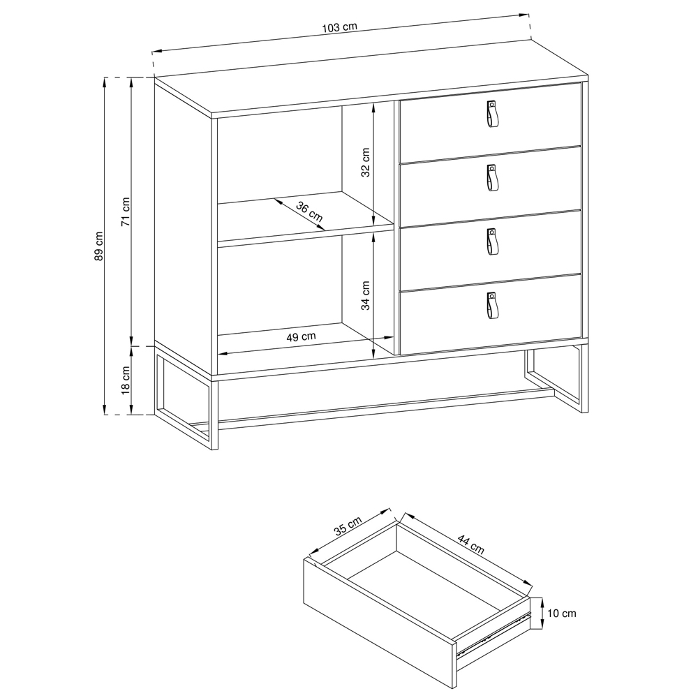 Комод Dark DK103 - это удобное и стильное решение, созданное для хранения ваших вещей. Оборудованный четырьмя выдвижными ящиками и полками, расположенными за распашной дверцей, он обеспечивает эффективное использование пространства. Поверхность комода станет идеальным местом для выставления ваших сувениров, украшений или фотографий.