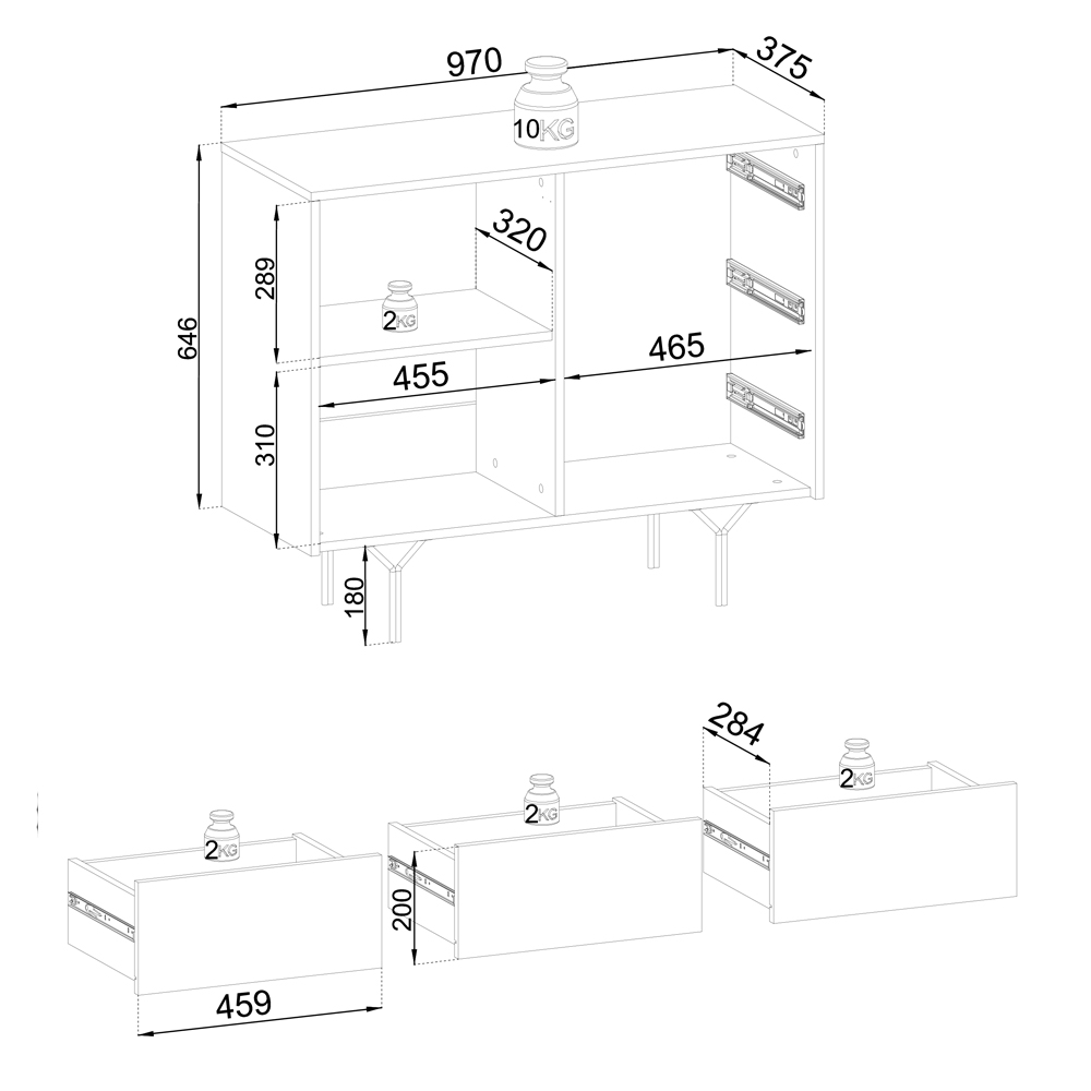 Корпус и фасад комода изготовлены из ДСП 16 мм с кромкой ABS 0,5 мм. Фрезерованные дверки выполнены из МДФ толщиной 18 мм. Ножки - это гнутый стальной брус размером 10х20х180 мм, окрашенный в черный цвет.