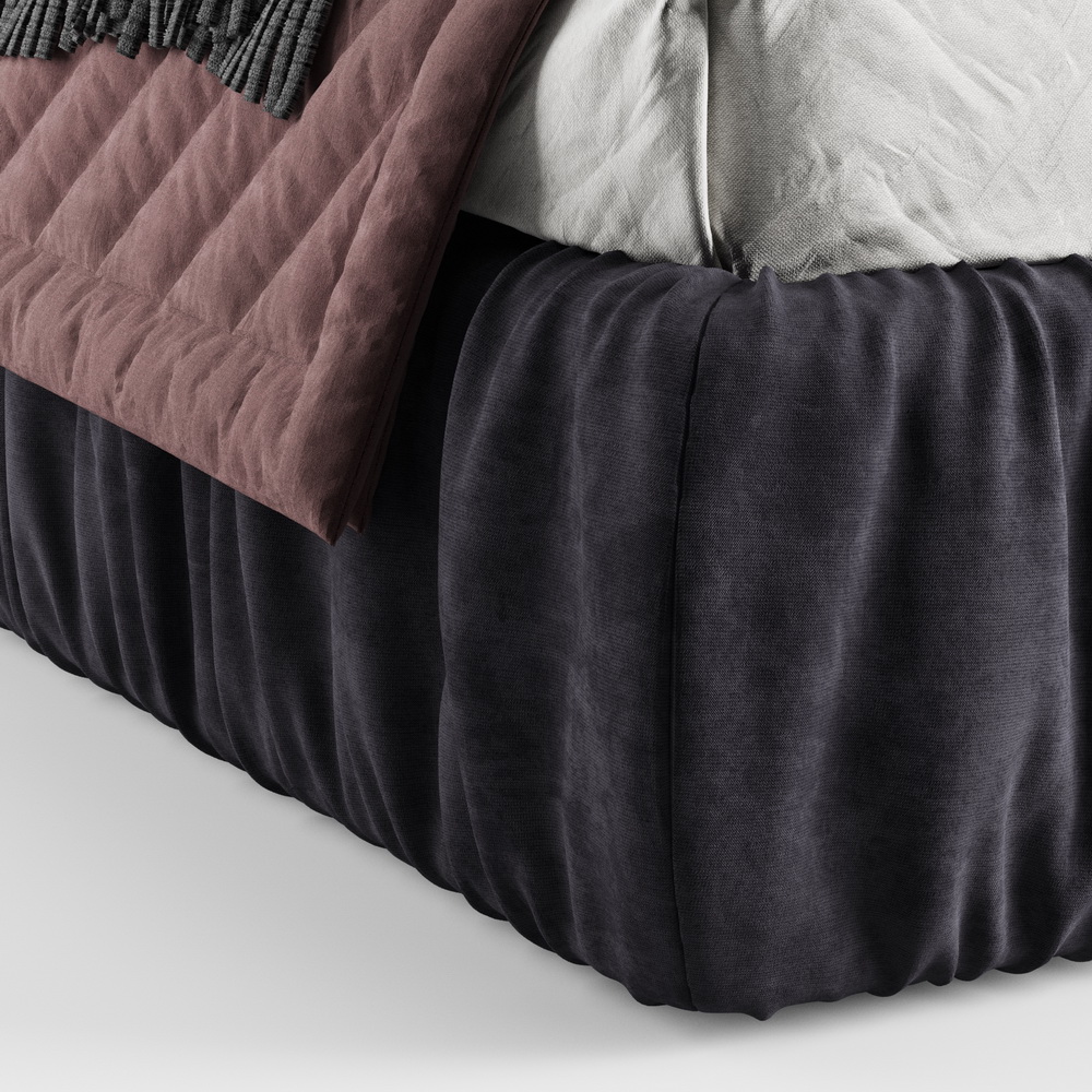 При создании кровати Kemi производители соединили лаконичность прямоугольного каркаса и пышность присборенной обивки. Изголовье и изножье выглядят почти полукруглыми, этот эффект получен благодаря синтепоновой подкладке под пышными сборками. Выглядит чрезвычайно уютно.