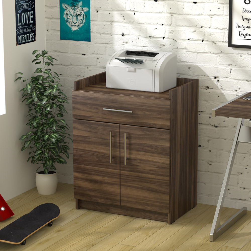 Тумба для принтера L-640 идеально подходит для обустройства офисного пространства и прекрасно сочетается с письменными столами и офисными стеллажами. Компактная и аккуратная тумба отлично впишется в современный офисный дизайн. Тумба оснащена выдвижным ящиком на всю ширину, огражденной верхней поверхностью для принтера или другого оборудования и отделением, закрытым двумя дверцами. Внутри отделения имеется полочка, разделяющая пространство на две зоны.