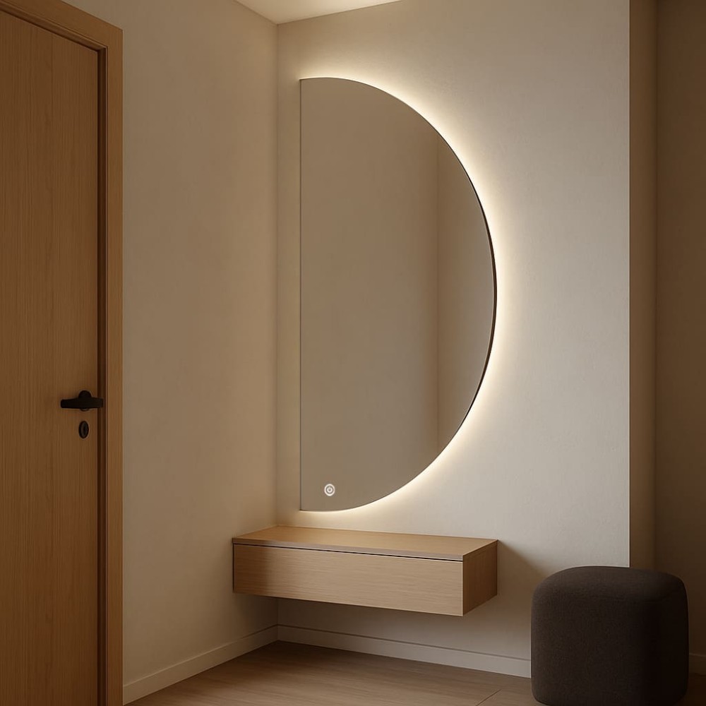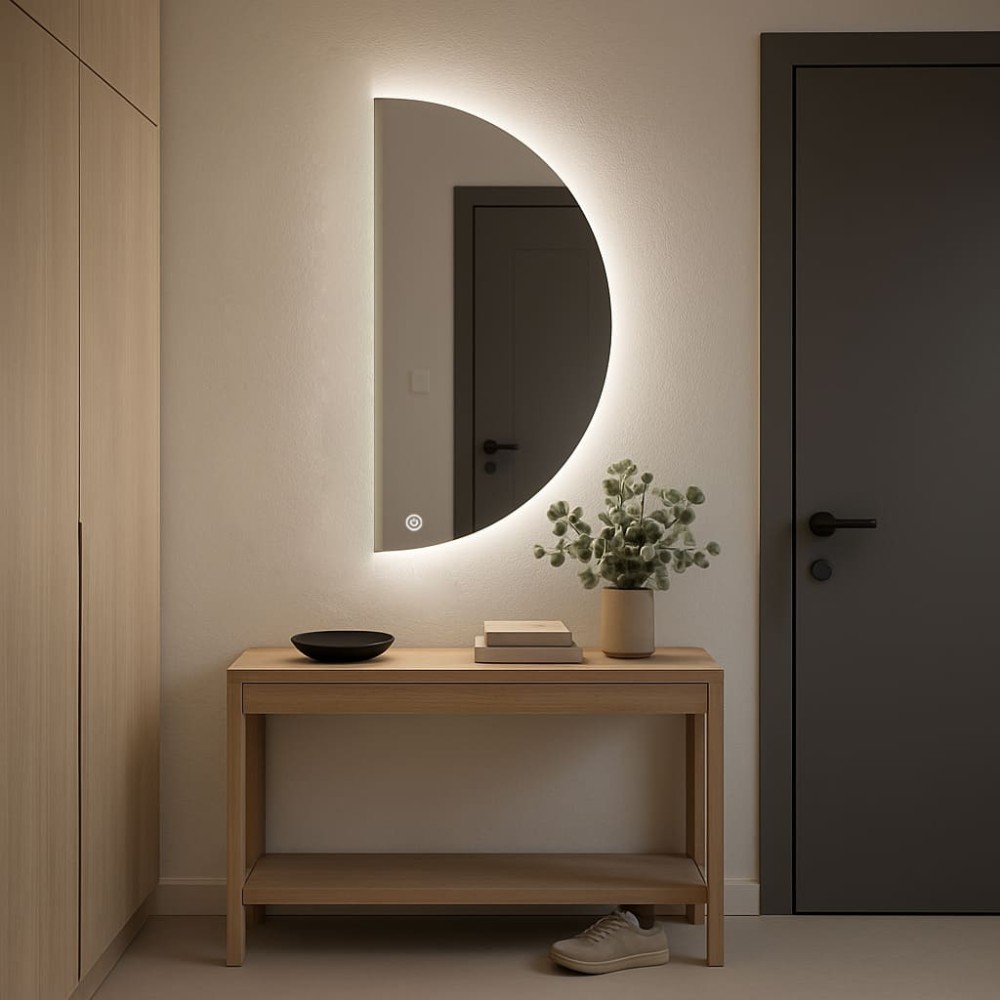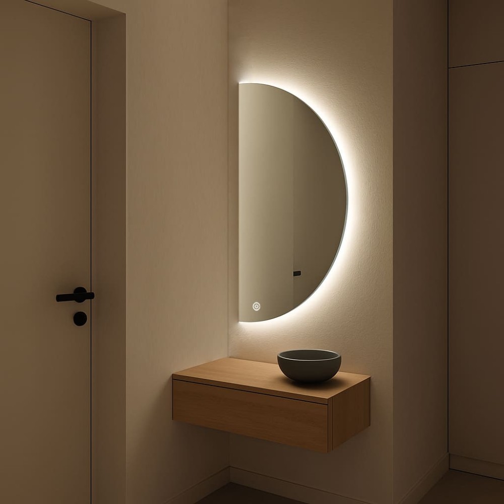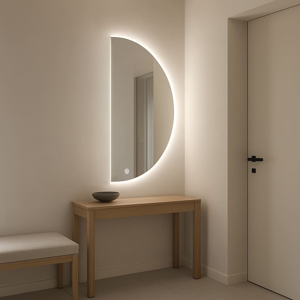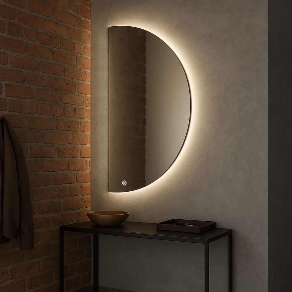 Зеркало полукруглое с фоновой подсветкой и сенсорной кнопкой создано для тех, кто ценит гармоничное сочетание дизайна и технологий. Благодаря плавной форме и мягкой LED-подсветке оно становится стильным акцентом в ванной, спальне или коридоре, создавая приятную атмосферу и придавая интерьеру современность.