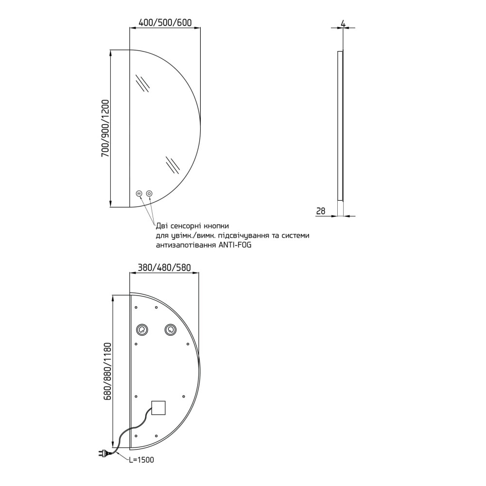 Зеркало полукруглое фоновая подсветка с сенсорной кнопкой 700х400 мм - 895420