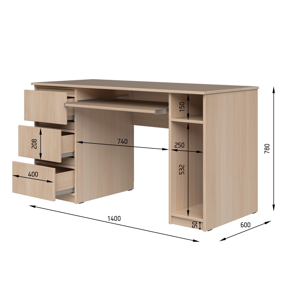 Стол компьютерный СК2 3Я сочетает в себе функциональность, комфорт и современный дизайн. Три вместительных выдвижных ящика обеспечивают удобное хранение документов, канцелярии и аксессуаров, а продуманное расположение полок и ниш делает рабочее пространство максимально организованным.