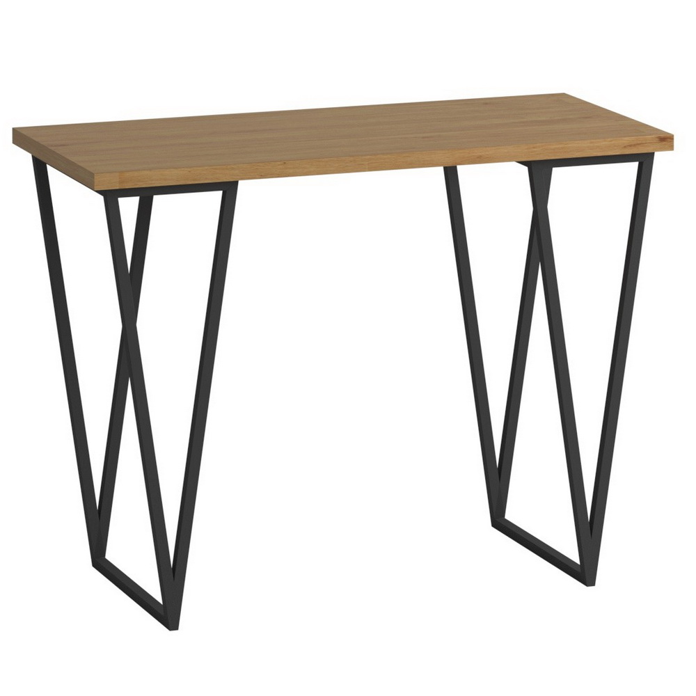 В качестве опор стола используются треугольные конструкции из металлической квадратной трубы. Столешница стола выполнена из ДСП.