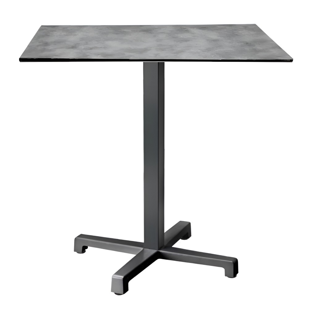 Нижняя крестовина размером 55х55 см изготовлена из чугуна и дополнена регулируемыми пятками на ножках, а центральная часть высотой 73 см - это квадратная стальная колонна с порошковым покрытием. Столешница выполнена из HPL толщиной 10 мм с имитацией матовой поверхности. Стол подходит для внутреннего и наружного использования.