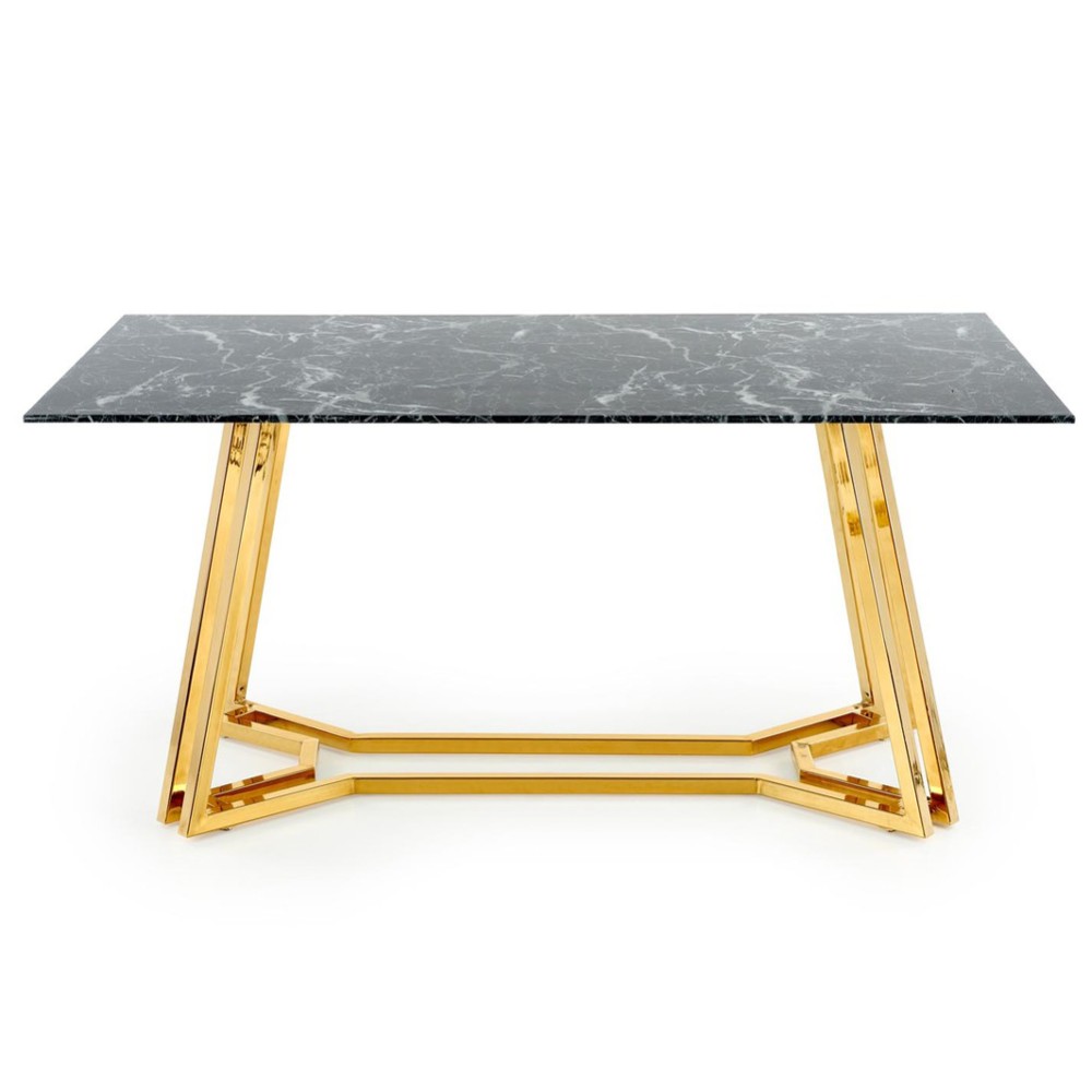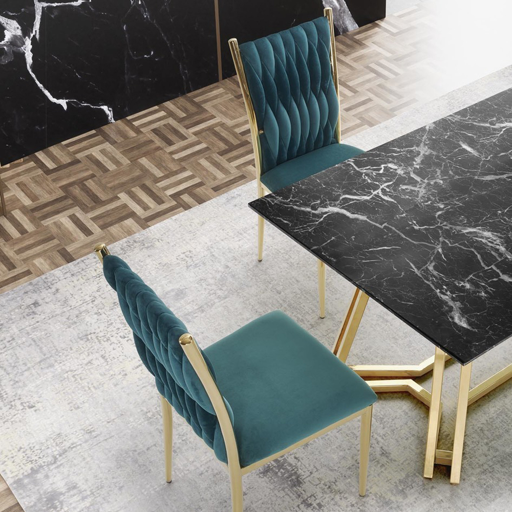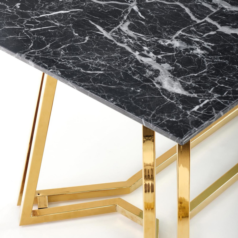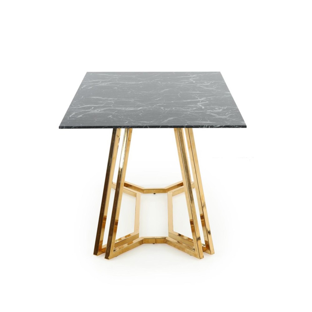 Столешница выполнена из стекла с эффектом черного мрамора, что придает столу дорогой и элегантный вид, а также устойчивость к загрязнениям и легкость в уходе. Ножки из хромированной стали с золотым покрытием обеспечивают надежность и долговечность конструкции, при этом делая стол визуально лёгким и стильным.