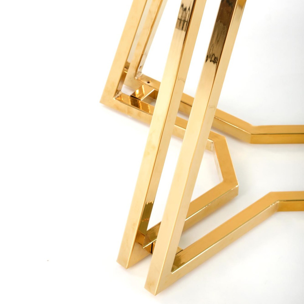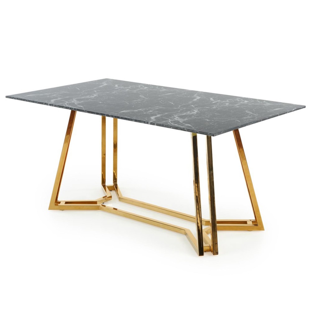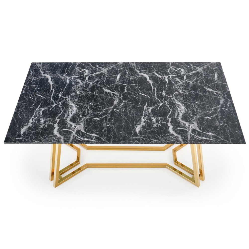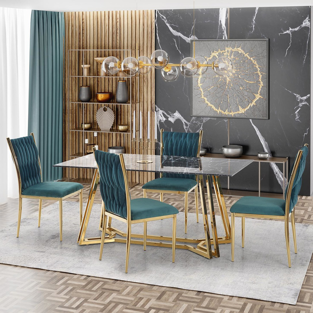 Столешница выполнена из стекла с эффектом черного мрамора, что придает столу дорогой и элегантный вид, а также устойчивость к загрязнениям и легкость в уходе. Ножки из хромированной стали с золотым покрытием обеспечивают надежность и долговечность конструкции, при этом делая стол визуально лёгким и стильным.