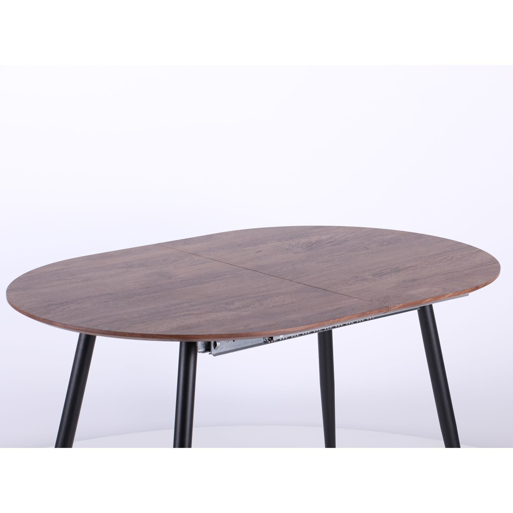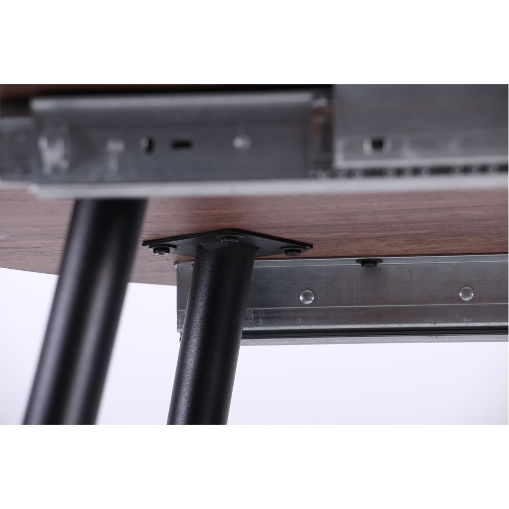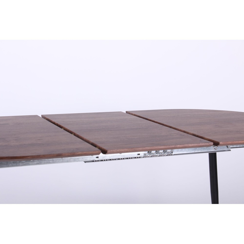 Столешница, выполненная из плиты МДФ толщиной 18 мм, покрыта искусственным шпоном с эффектом 3D, что делает поверхность визуально интересной. Механизм раскладывания стола состоит из специальной отдельной вставки и прочных металлических полозьев, которые обеспечивают плавность движения и устойчивость конструкции. Пластиковые заглушки на ножках стола не только предотвращают царапины и повреждения вашего напольного покрытия, но и подчеркивают внимание к деталям и комфорт использования.