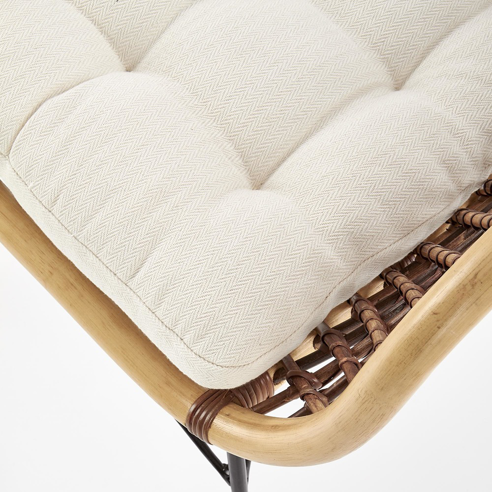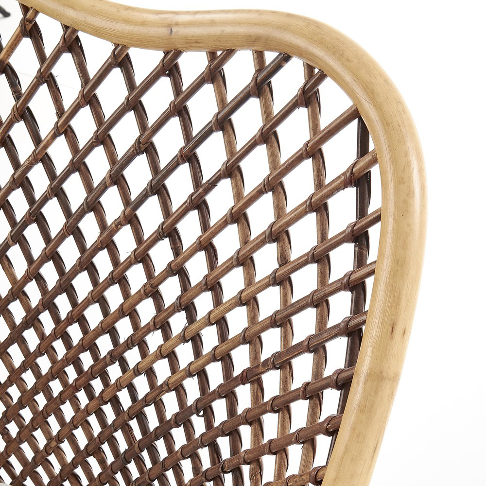 Каркас сиденья выполнен из светлого ротанга, а внутренняя часть украшена изящной тесьмой более темного оттенка, создающей красивый визуальный акцент.