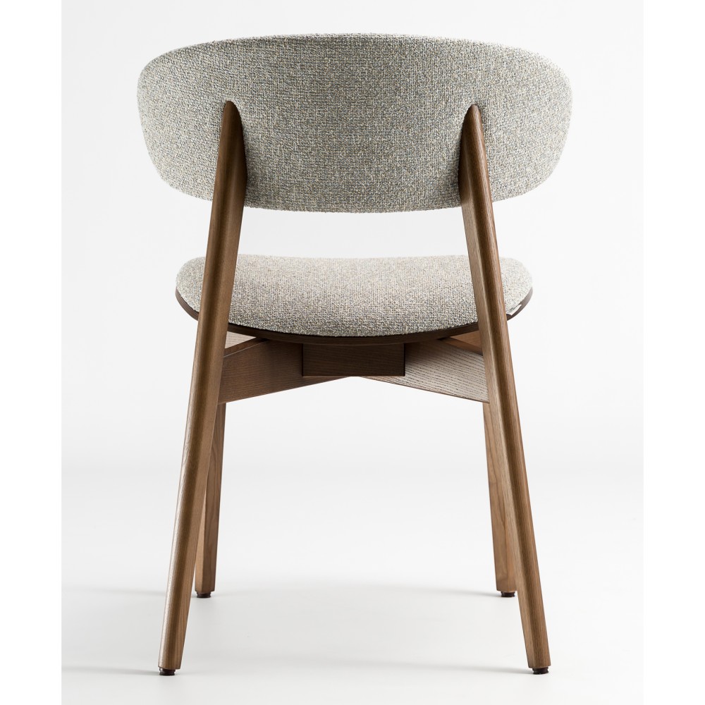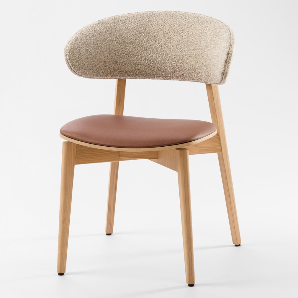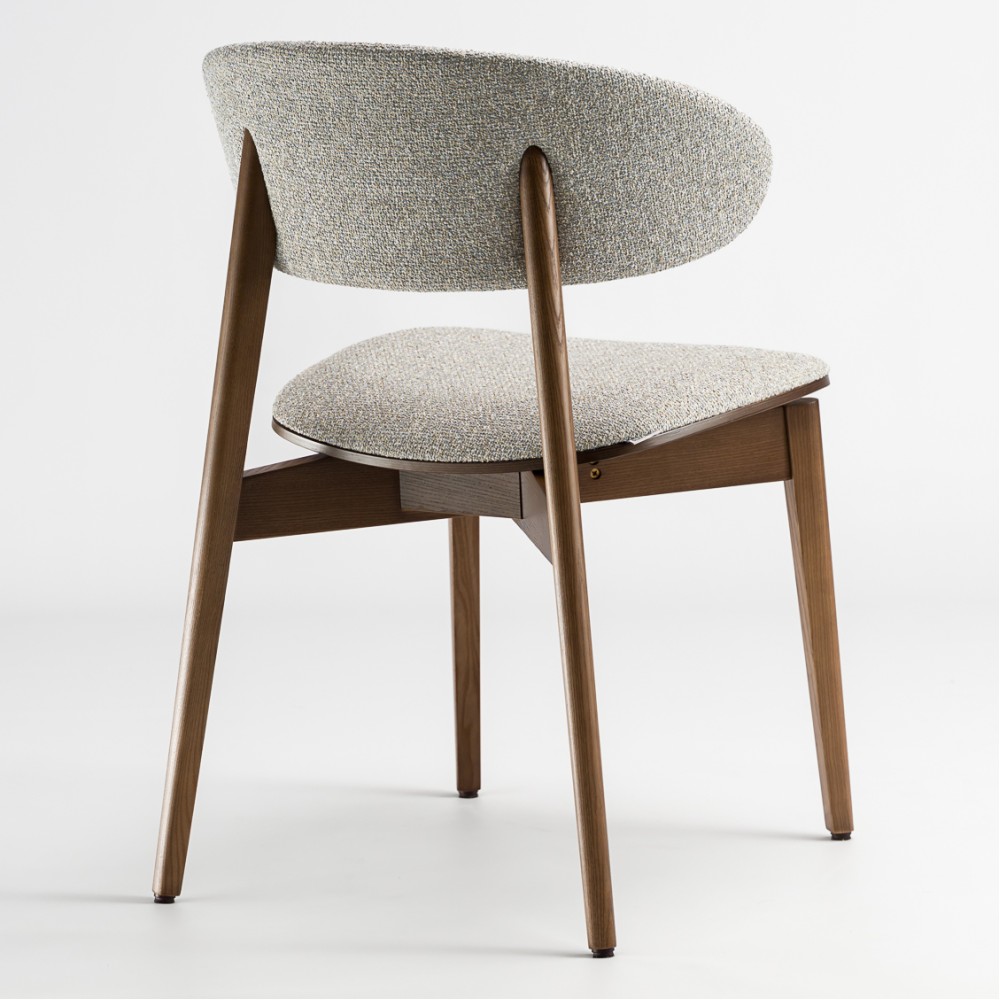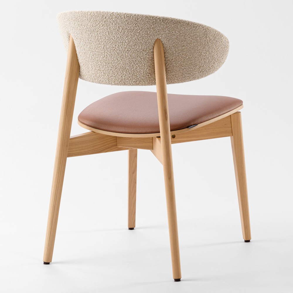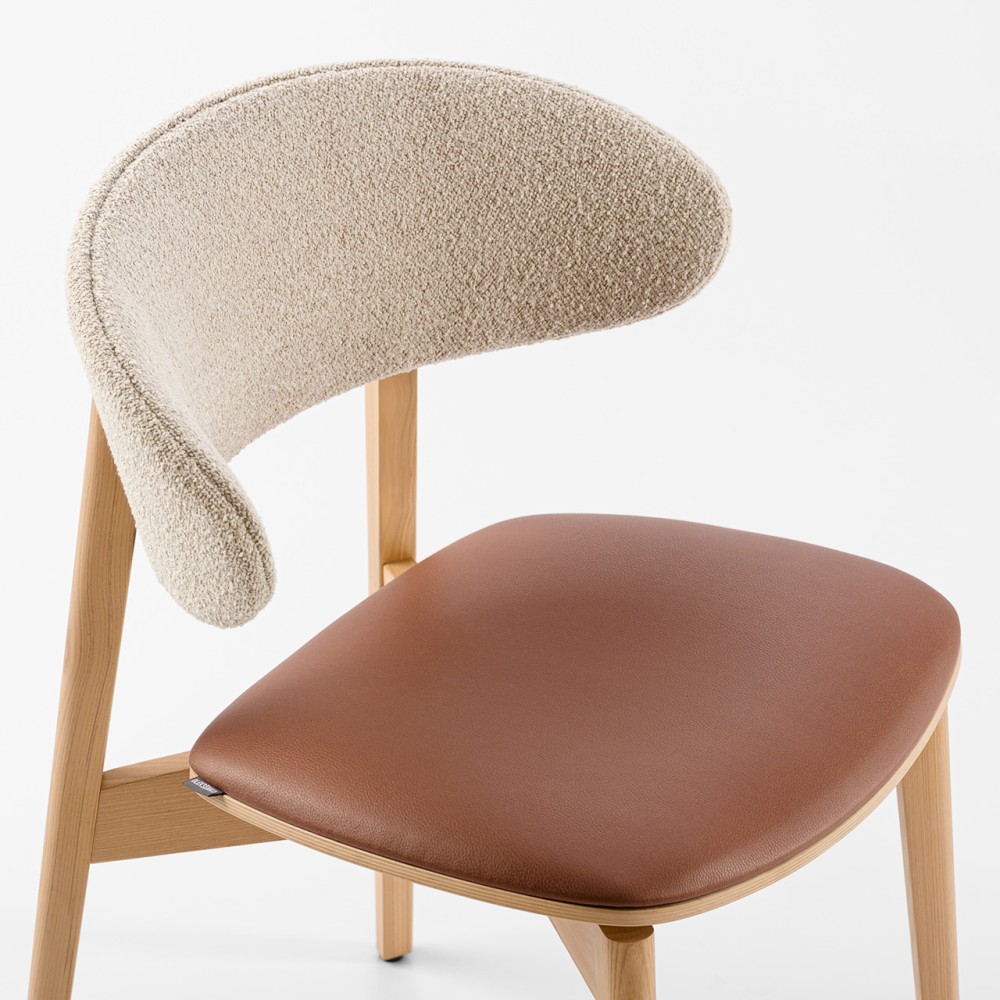 Задняя часть спинки покрыта тканью, что делает стул более элегантным и приятным на ощупь. Возможность сочетания двух разных видов ткани позволяет создавать эффектные акцентные решения — особенно актуально для современных кухонь и заведений HoReCa.