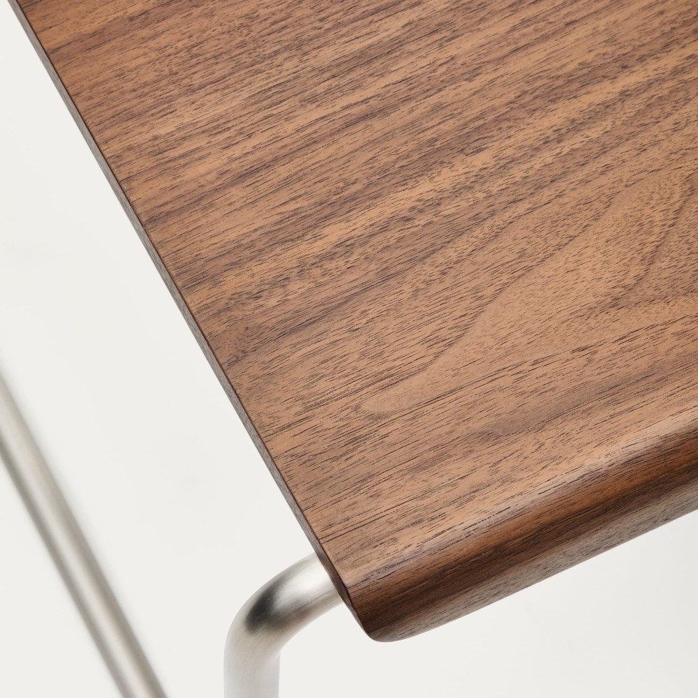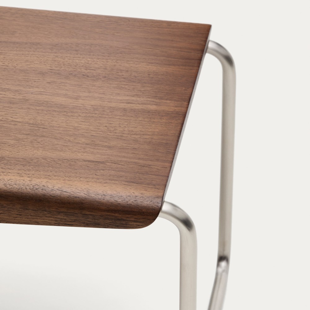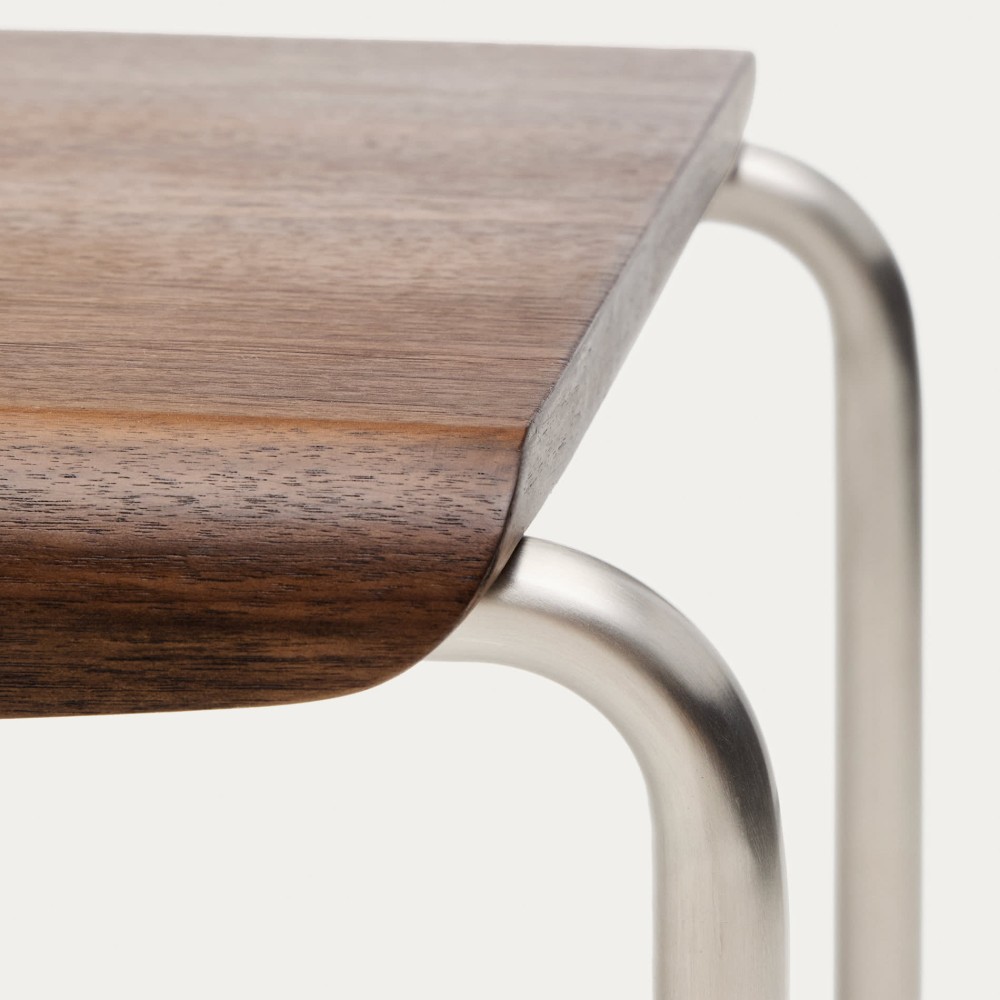 Сиденье выполнено из шпона ореха толщиной 0,6 мм с темной отделкой, который эффектно контрастирует с трубчатой конструкцией из нержавеющей стали. Матовая поверхность металла уменьшает видимость отпечатков пальцев и подчеркивает современный характер изделия.