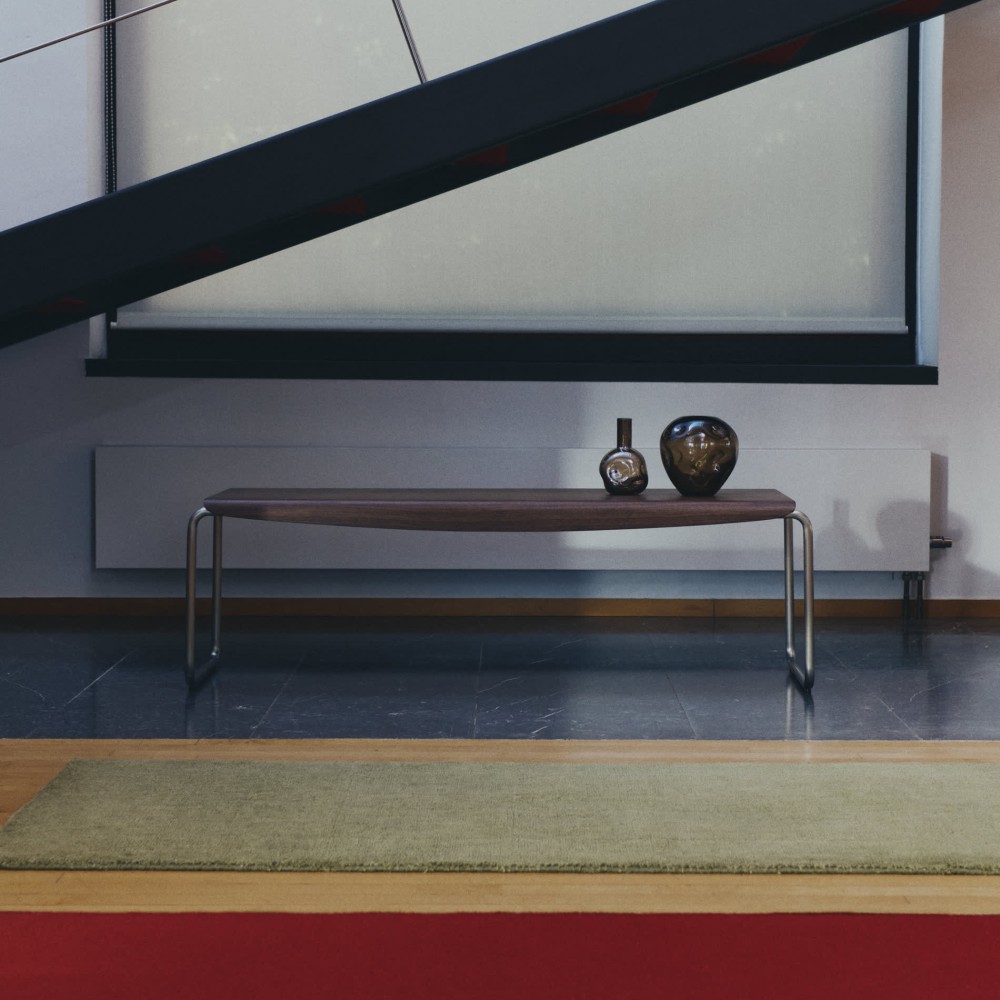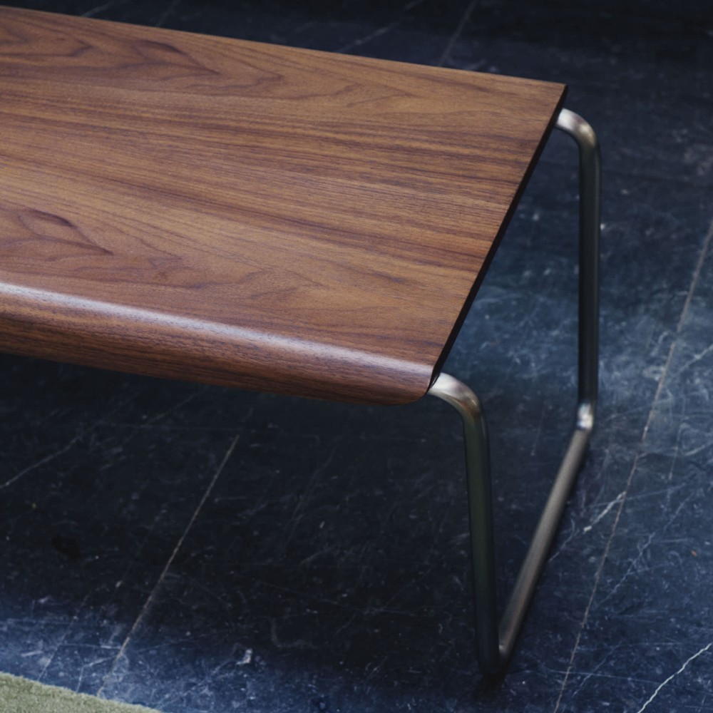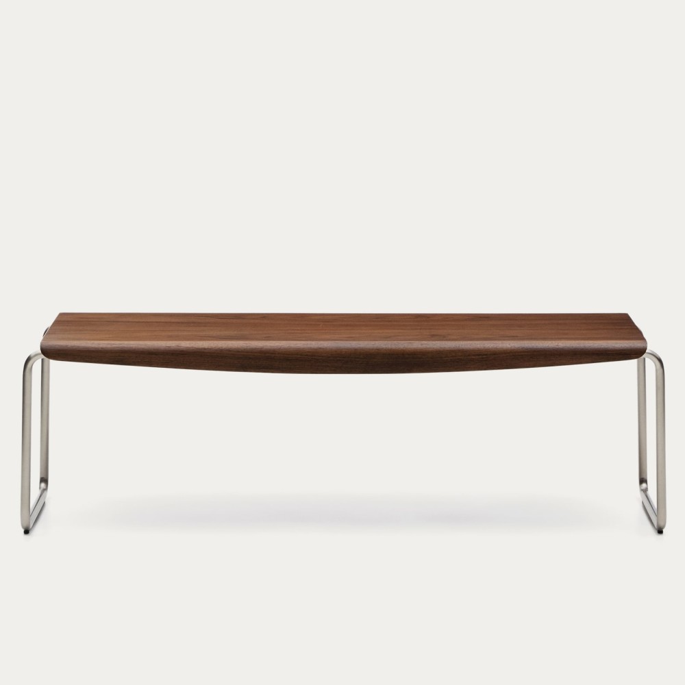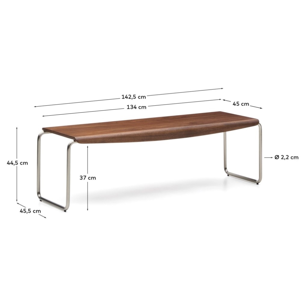 Сиденье выполнено из шпона ореха толщиной 0,6 мм с темной отделкой, который эффектно контрастирует с трубчатой конструкцией из нержавеющей стали. Матовая поверхность металла уменьшает видимость отпечатков пальцев и подчеркивает современный характер изделия.