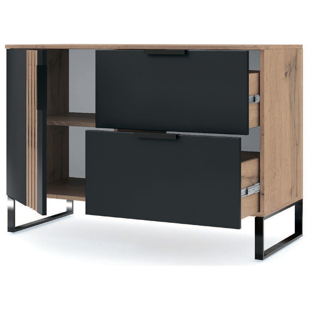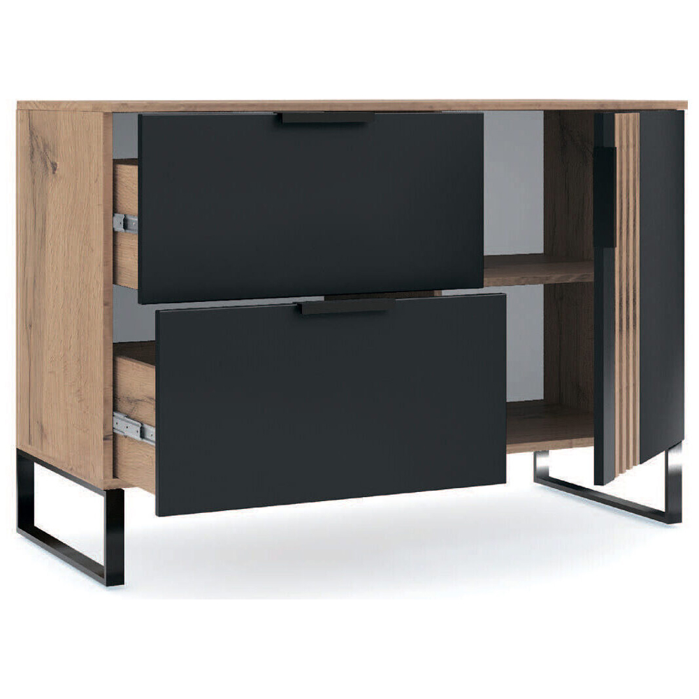 Комод Лайн Декор не лише покращить інтер'єр вашої кімнати, а й додасть їй функціональності. Цей практичний виріб надає ідеальне місце для зберігання різних предметів завдяки двом висувним ящикам та відділенню з дверцятами і полицями всередині. На його поверхні можна розмістити фотографії, коллекцію книг, вазу з квітами та інші оригінальні декоративні елементи, що надають кімнаті особливого шарму. Цей комод не тільки задовольнить ваші потреби в зберіганні, але стане акцентним елементом вашого інтер'єру.