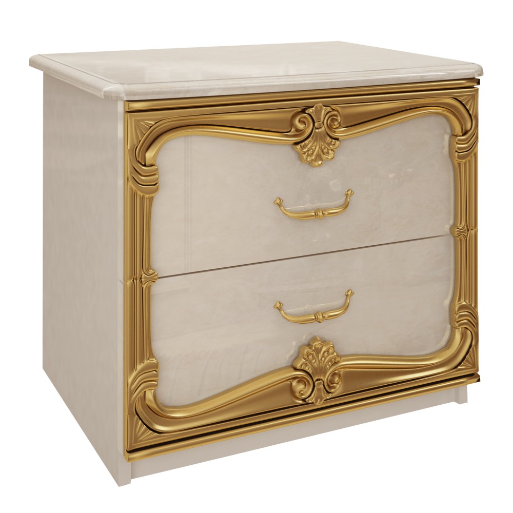 Тумба приліжкова Victoria - це практичне та стильне рішення для вашої спальні. Виріб забезпечить зручне місце для зберігання різних речей завдяки двом висувним ящикам, які вміщують велику кількість предметів. Тумбочка відрізняється декоративними елементами у золотому кольорі, які додають об'єму меблів. Поєднання світлих та ніжних тонів із золотом повністю передає розкіш класичного стилю.