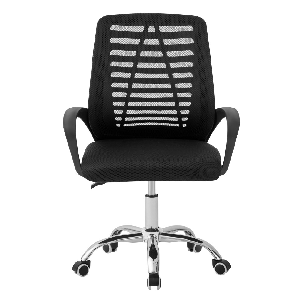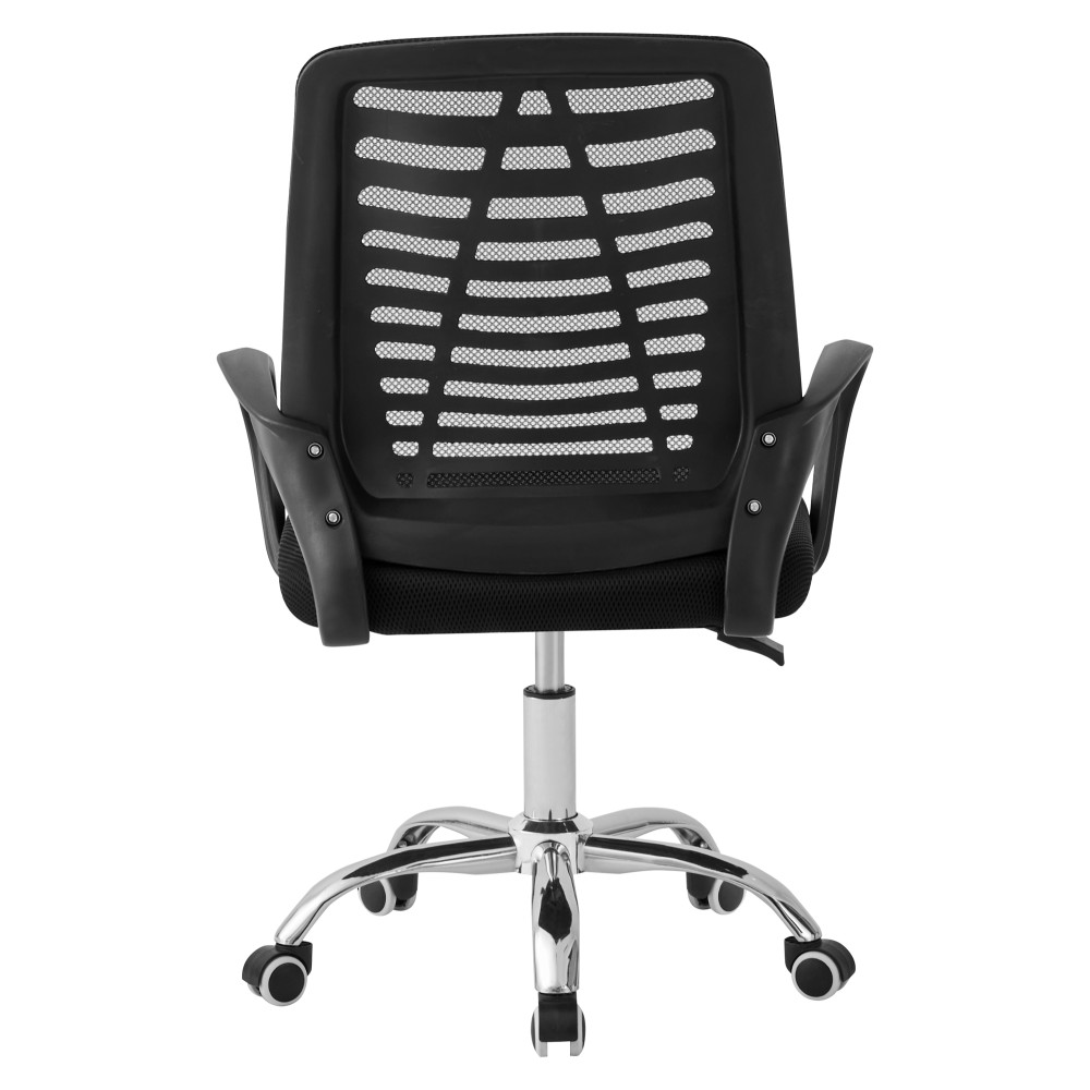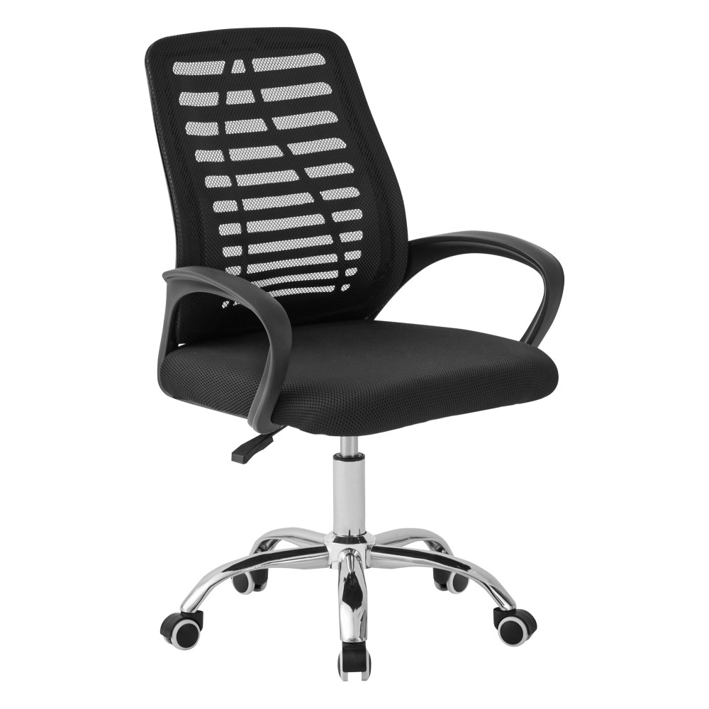 Спинка виконана з сітчастої тканини з високим вмістом еластомеру, що забезпечує міцність і відмінну вентиляцію. Сидіння з поліпропілену стійке до зносу. Хромована хрестовина з прогумованими роликами гарантує стійкість, безшумне пересування і захист підлогових покриттів.