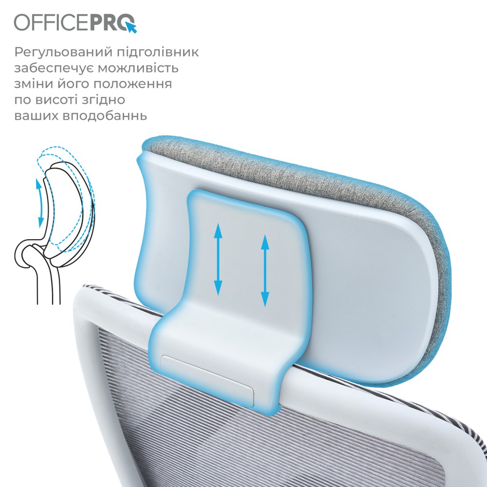 Сітчаста спинка забезпечує відмінну вентиляцію, запобігаючи перегріву, а м’яке сидіння з наповненням із піни додає зручності навіть при багатогодинному використанні. Регульований підголівник із м’якою вставкою дозволяє налаштувати комфортне положення голови та шиї.