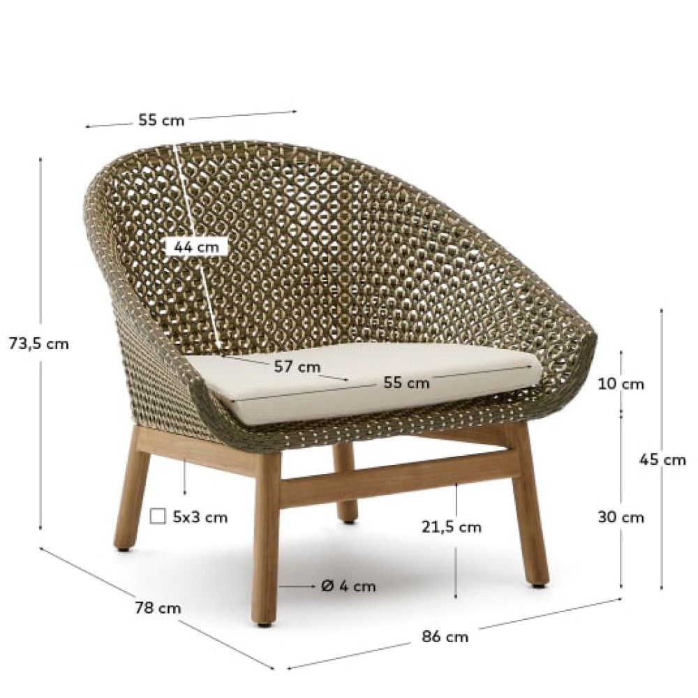 Крісло Olbia — це стильне рішення для тих, хто цінує баланс між сучасним дизайном і природною естетикою. Продумана форма, натуральні матеріали та комфортні подушки створюють затишну атмосферу на терасі, в саду або лаунж-зоні. Завдяки якісним матеріалам і ручній роботі, крісло не тільки виглядає елегантно, але і зберігає свій зовнішній вигляд навіть при тривалому використанні на відкритому повітрі.