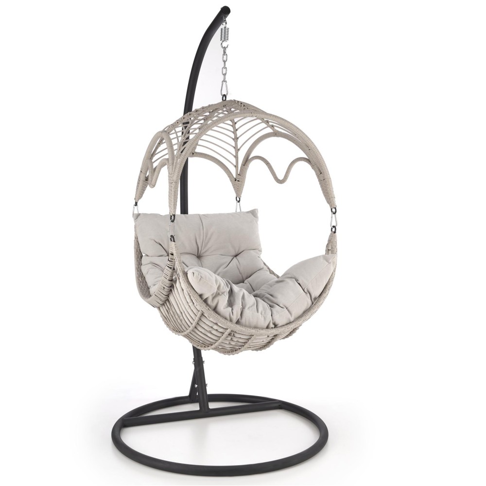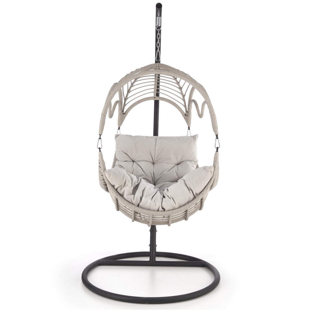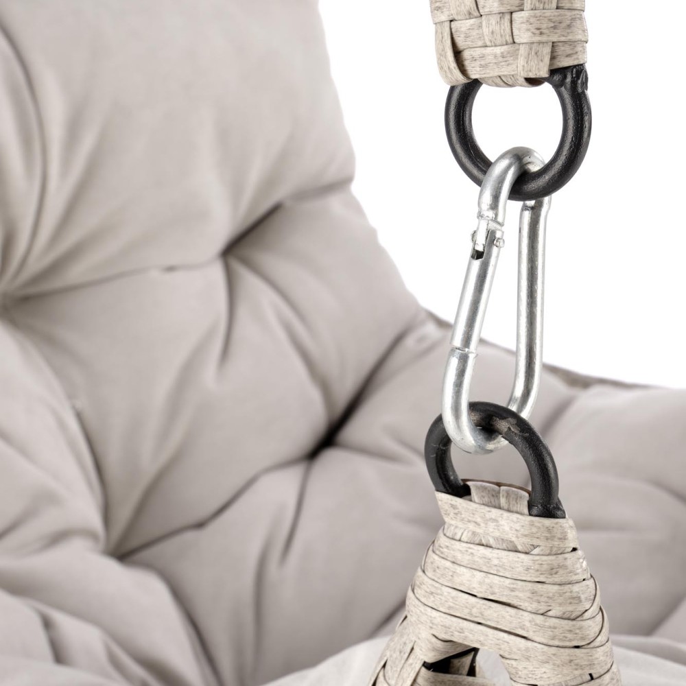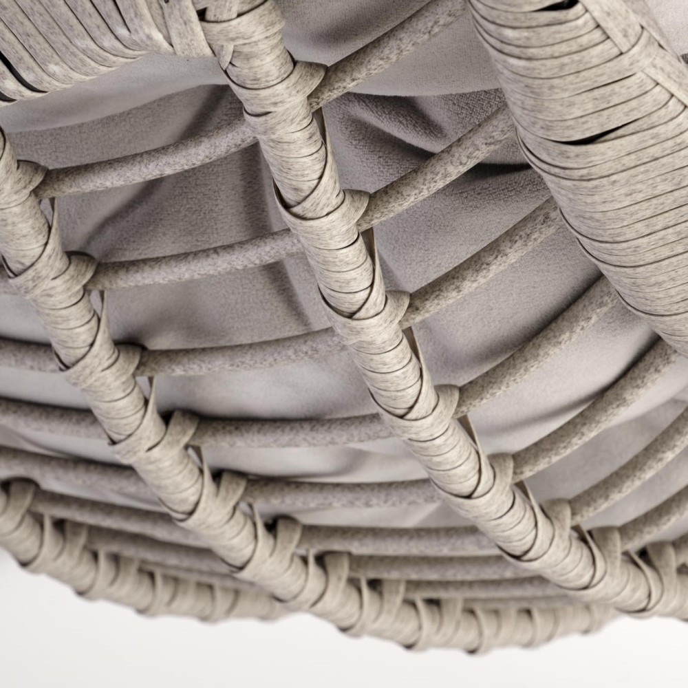 Сидіння ковшоподібної форми виконано з міцного синтетичного ротанга, стійкого до сонця, вологи та перепадів температур. Додатковий комфорт забезпечує велика м'яка подушка світло-попелястого кольору, яка запрошує влаштуватися зручніше і насолодитися моментом.