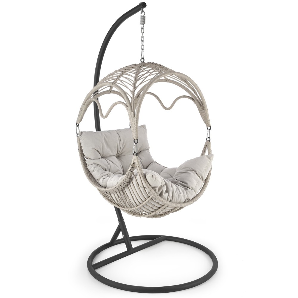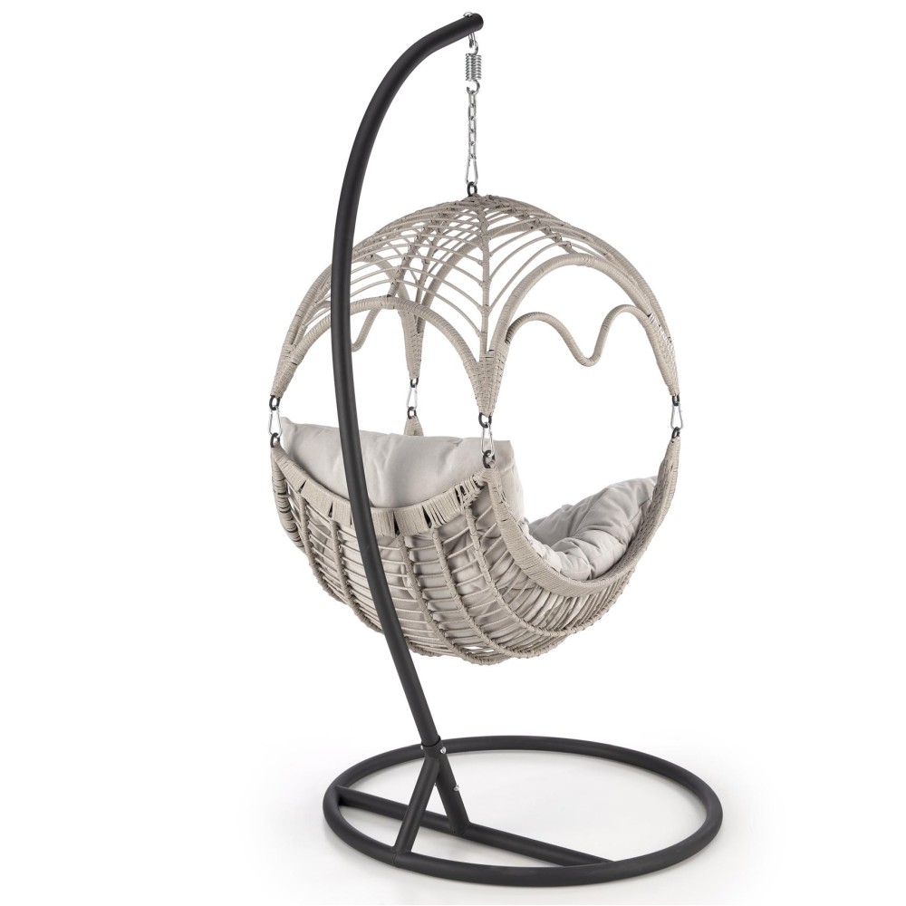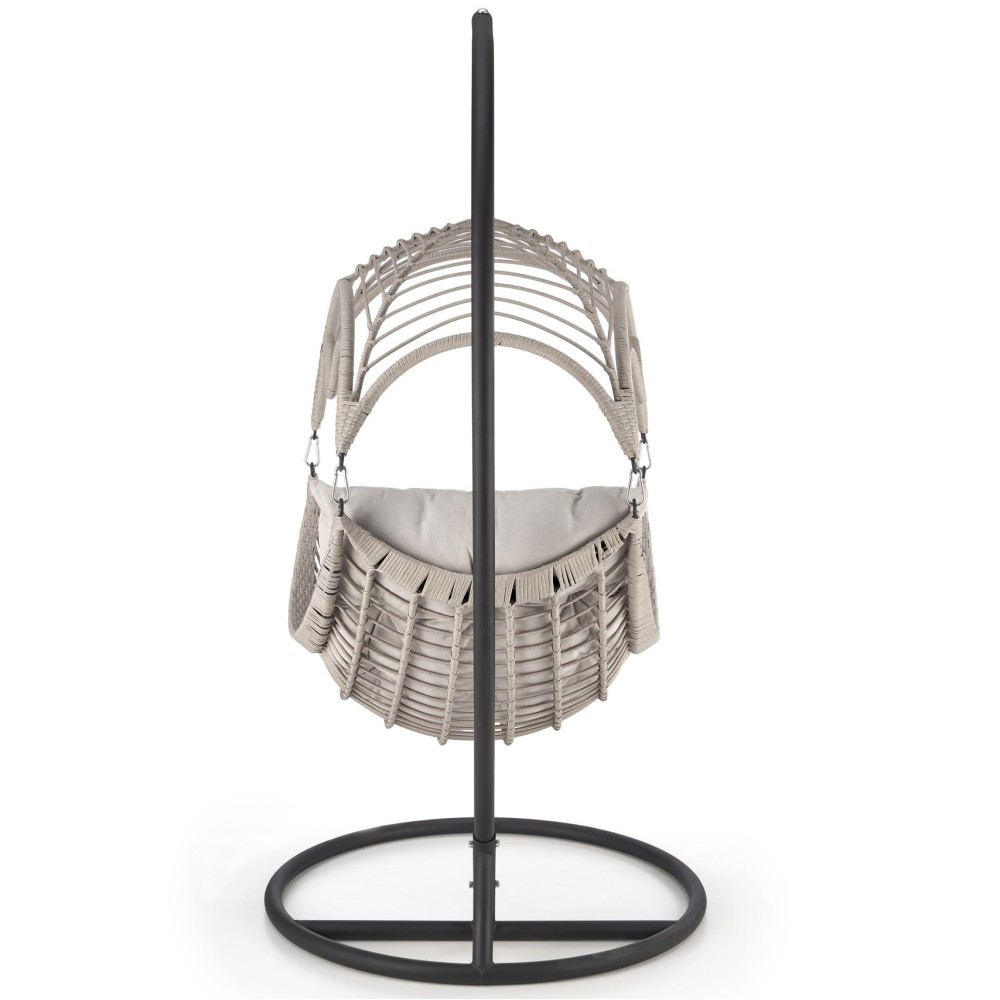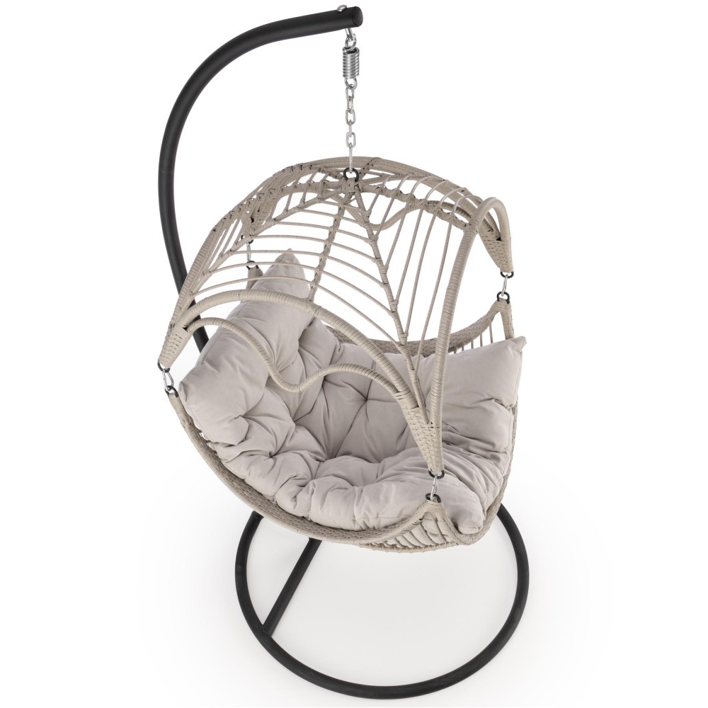 Сидіння ковшоподібної форми виконано з міцного синтетичного ротанга, стійкого до сонця, вологи та перепадів температур. Додатковий комфорт забезпечує велика м'яка подушка світло-попелястого кольору, яка запрошує влаштуватися зручніше і насолодитися моментом.