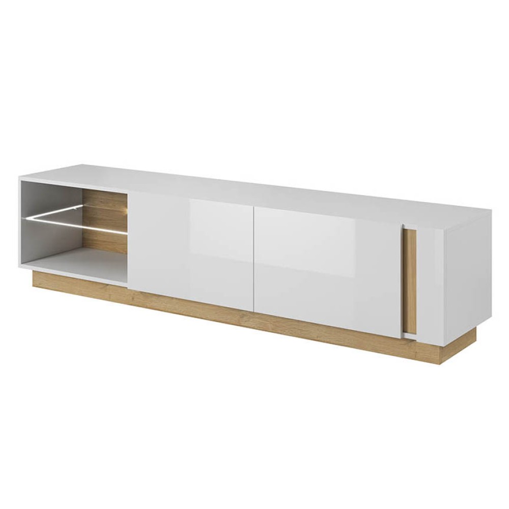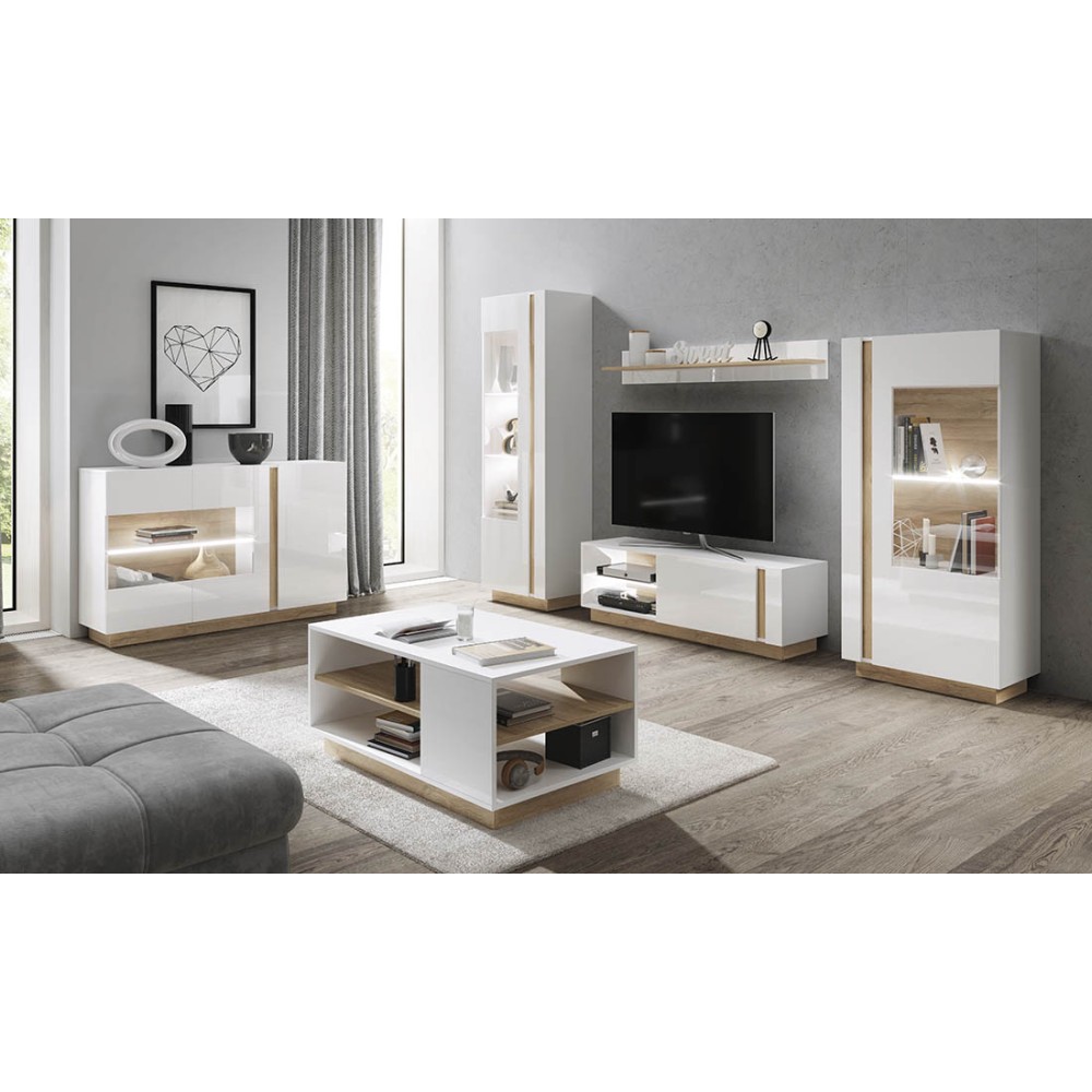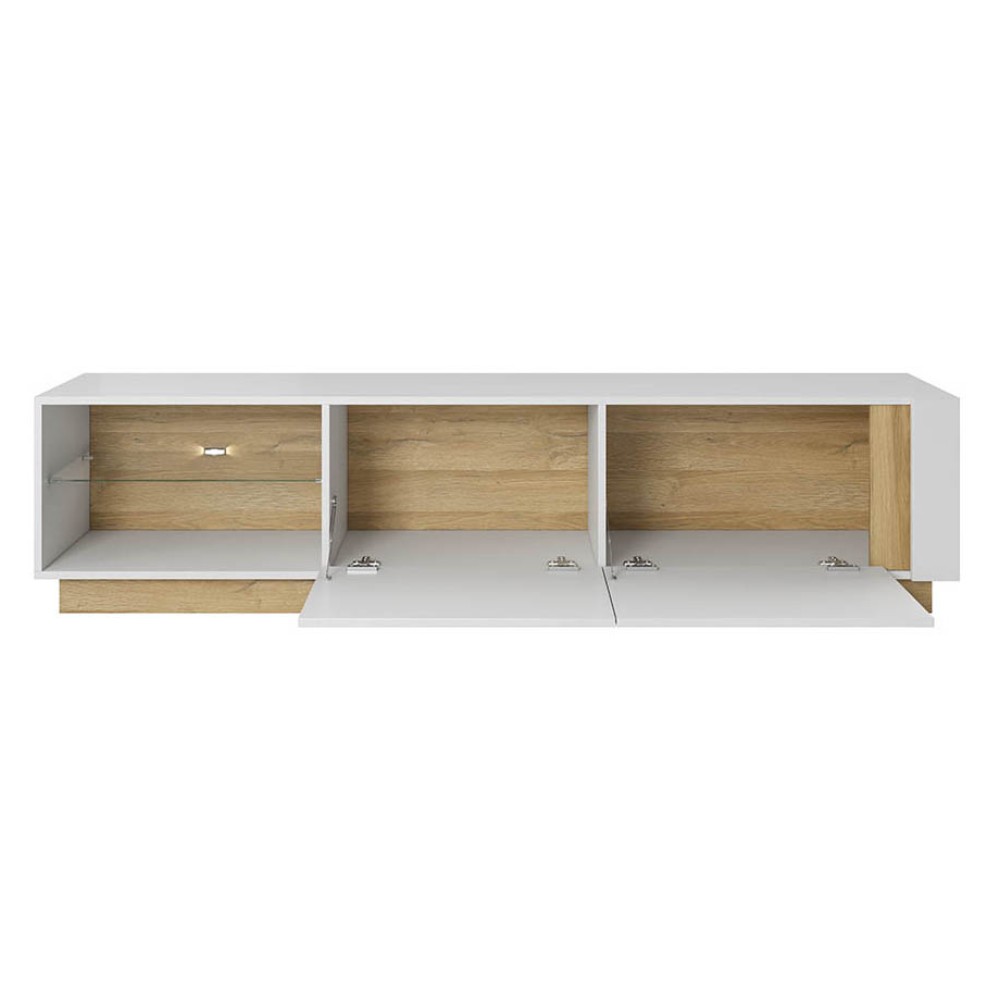 Тумба ТВ Глос - це стильне та функціональне рішення для вашої вітальні. Її корпус і фасади виконані з ламінованої ДСП E05 товщиною 16 мм, що надає їм блиск білого кольору в поєднанні з текстурою дуба. Міцна задня стінка виготовлена з ХДФ, забезпечуючи надійність конструкції. Крайка з матеріалу ABS в тонкощі ДСП додає завершеності кожній деталі. Полиці виготовлені з негазованого скла, надаючи тумбі вишуканого та легкого вигляду. Тумба оснащена механізмами відкривання дверей "push-to-open", що забезпечує зручність відкривання без ручок.
