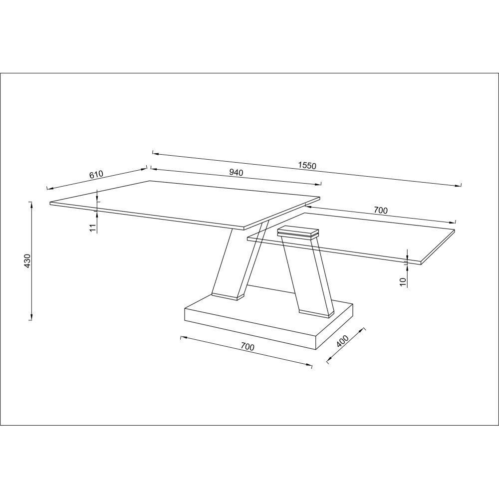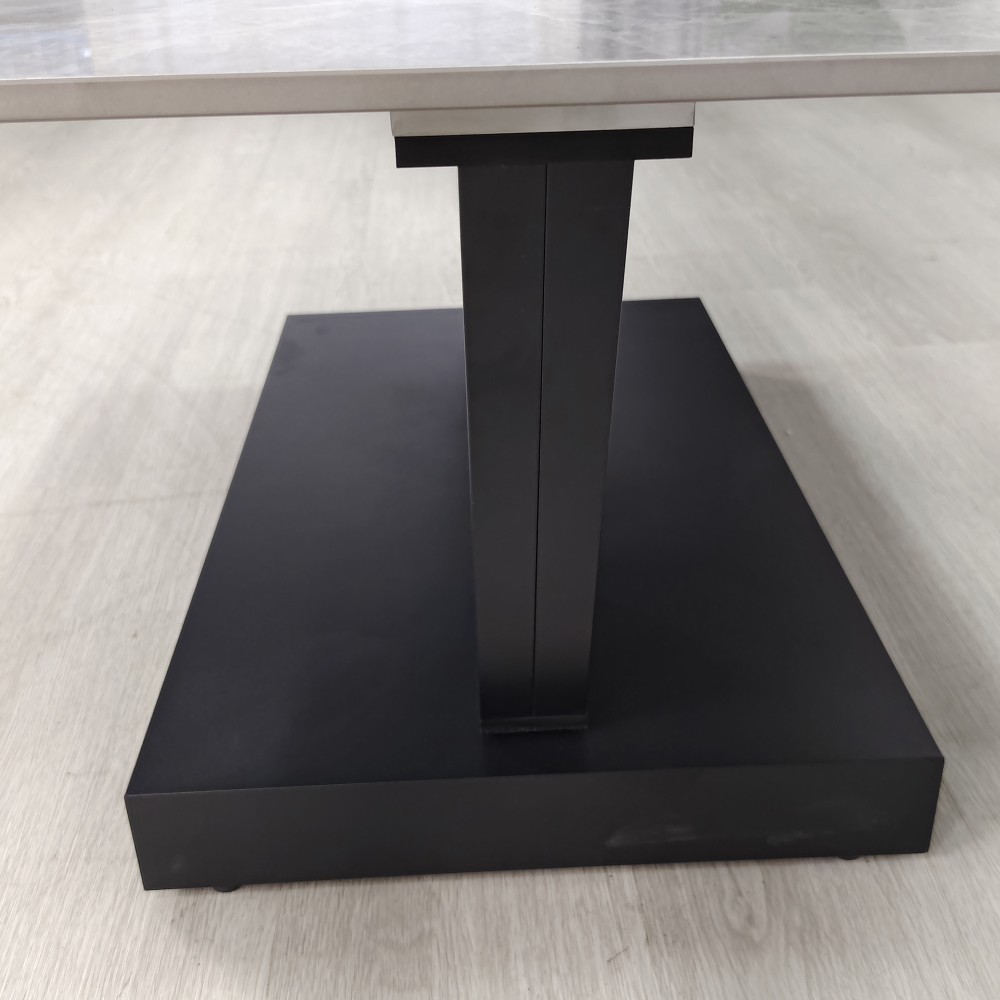 Другий рівень — 10-мм загартоване прозоре скло, яке створює додаткову полицю та візуально «полегшує» конструкцію. Таке поєднання матеріалів виглядає дорого та додає столу індивідуальності.