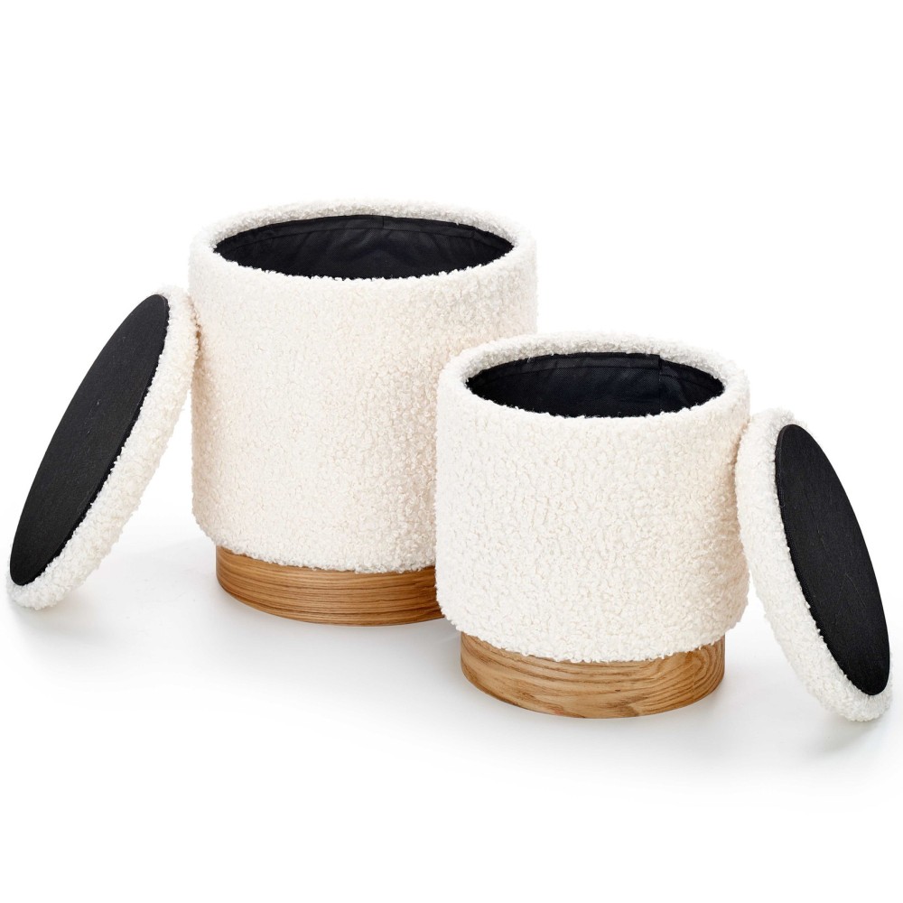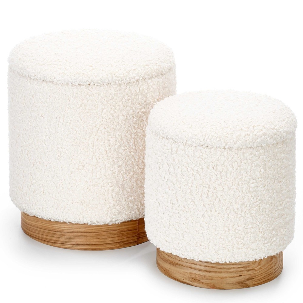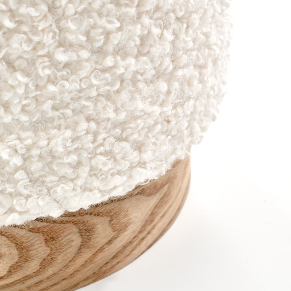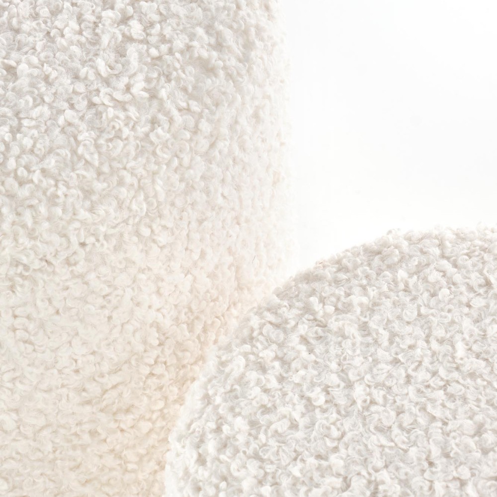 Модель оббита модною тканиною букле кремового кольору - м'якою, приємною на дотик і візуально цікавою. Завдяки поєднанню текстильної оббивки з основою з гнутої фанери та шпону під дерево, пуфи мають особливо елегантний і сучасний вигляд. Натуральні відтінки й округла форма створюють відчуття тепла та гармонії в інтер'єрі.