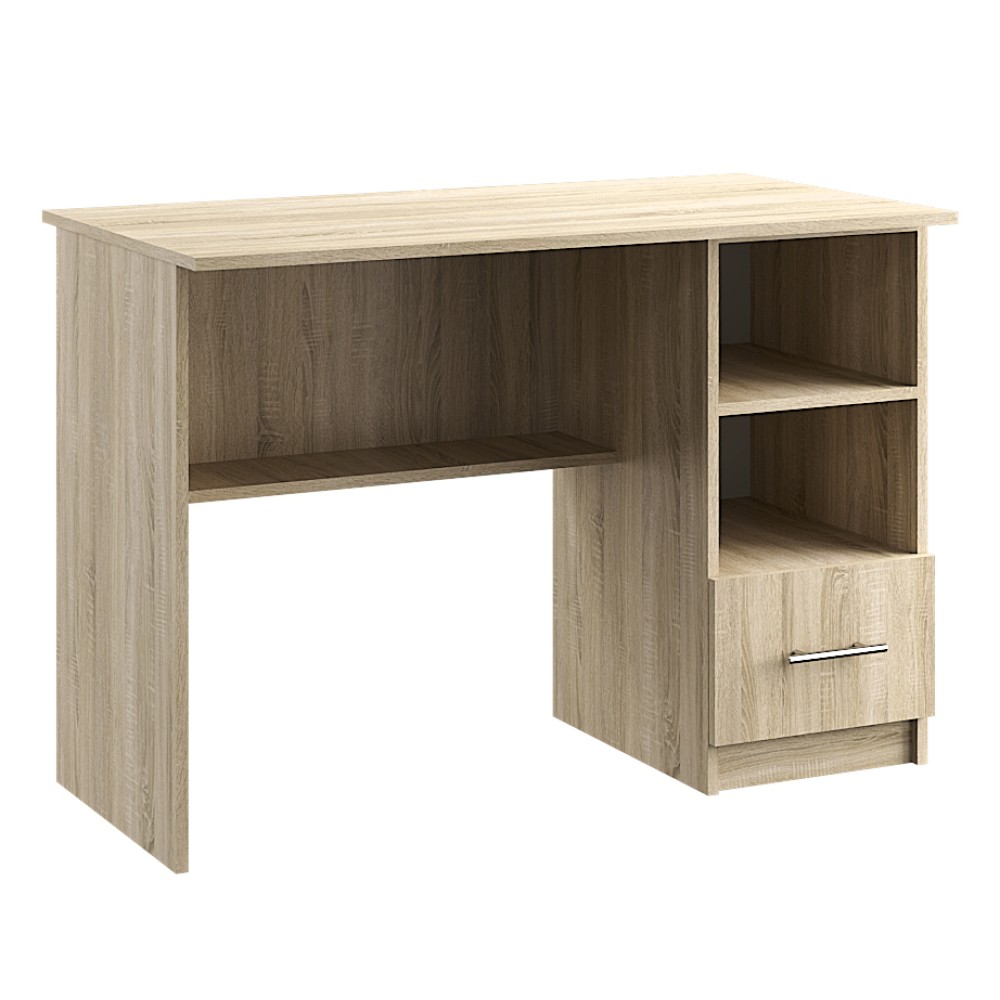 Стіл ОфС № 04 є ідеальним доповненням для офісу, дитячого чи домашнього кабінету, створюючи стильну та функціональну робочу обстановку. Стіл оснащений одним висувним ящиком, що надає зручне місце для зберігання канцелярського приладдя та особистих речей. Два відкриті відділення ідеально підходять для розміщення книг, файлів та декоративних предметів. Виготовлений із міцного ДСП, стіл забезпечує довговічність та надійність, а його дизайн надає офісному простору стильного та сучасного вигляду.