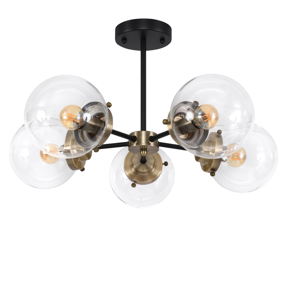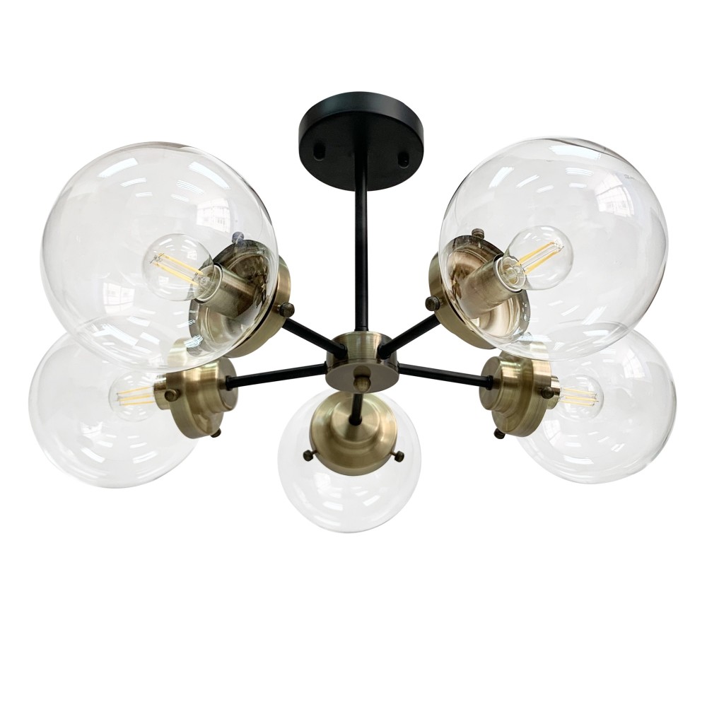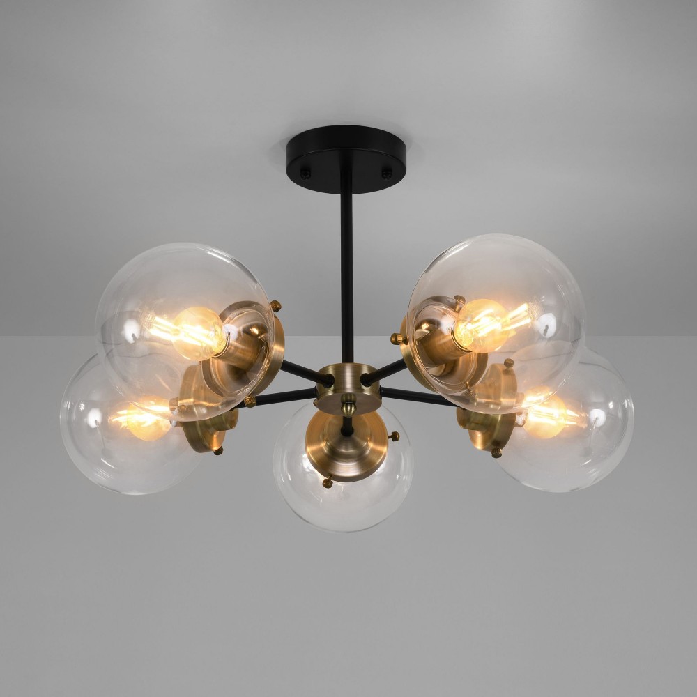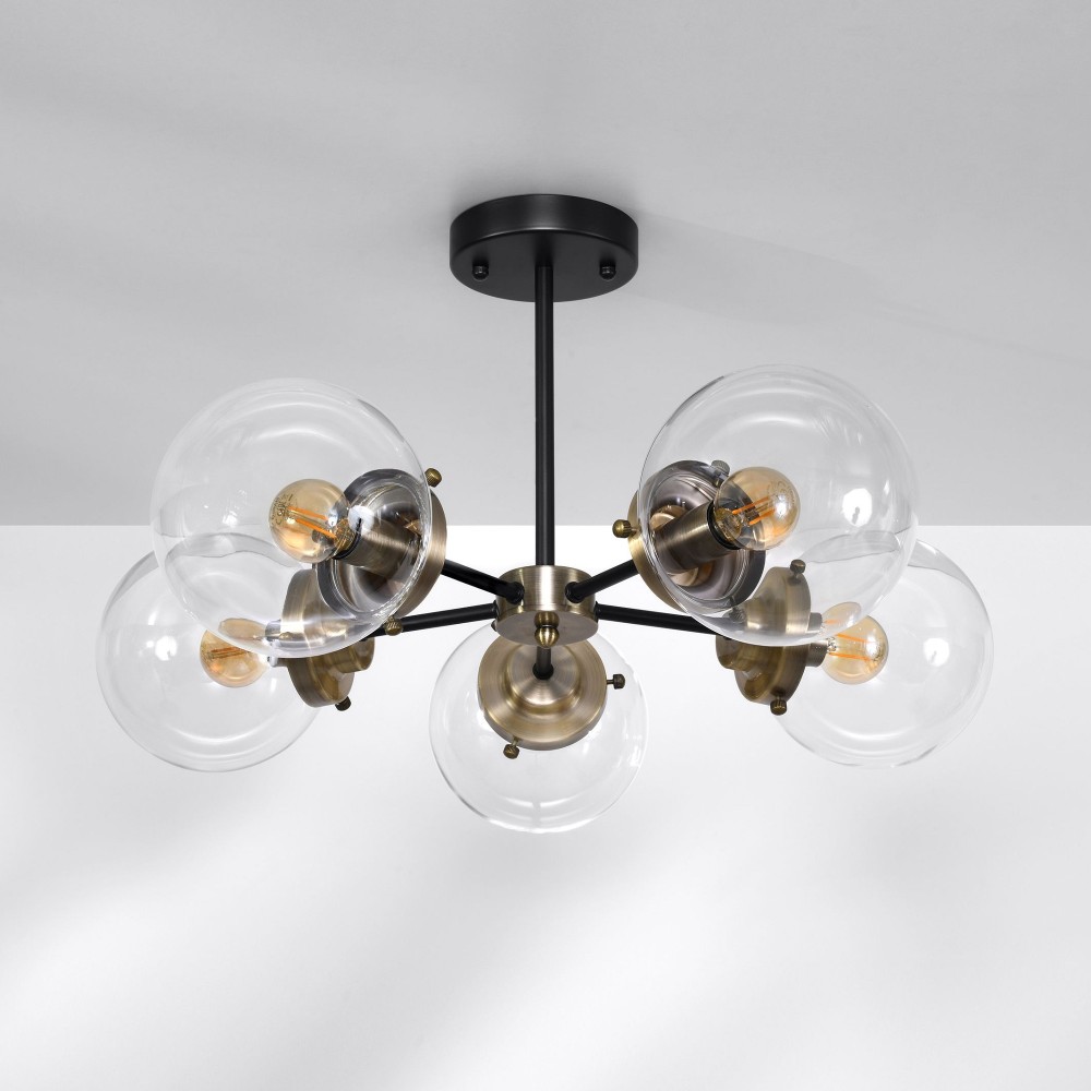• Модель має п’ять прозорих скляних плафонів, які рівномірно розсіюють світло, створюючи приємну атмосферу у кімнаті.
