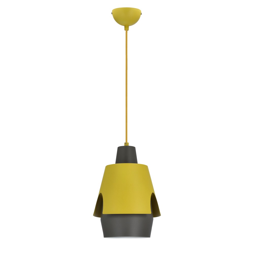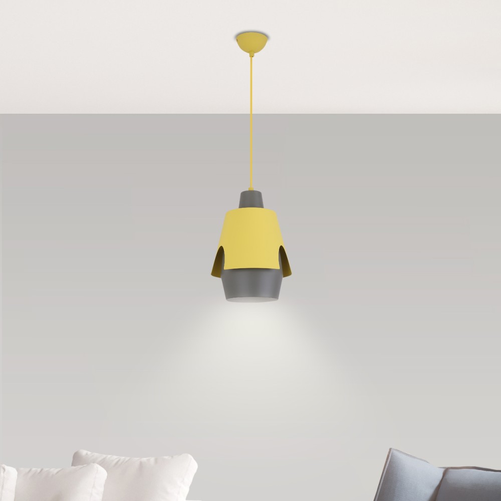 - Абажур у жовто-сірій кольоровій гамі виглядає ефектно та гармонійно поєднується з металевою основою, створюючи елегантний контраст.