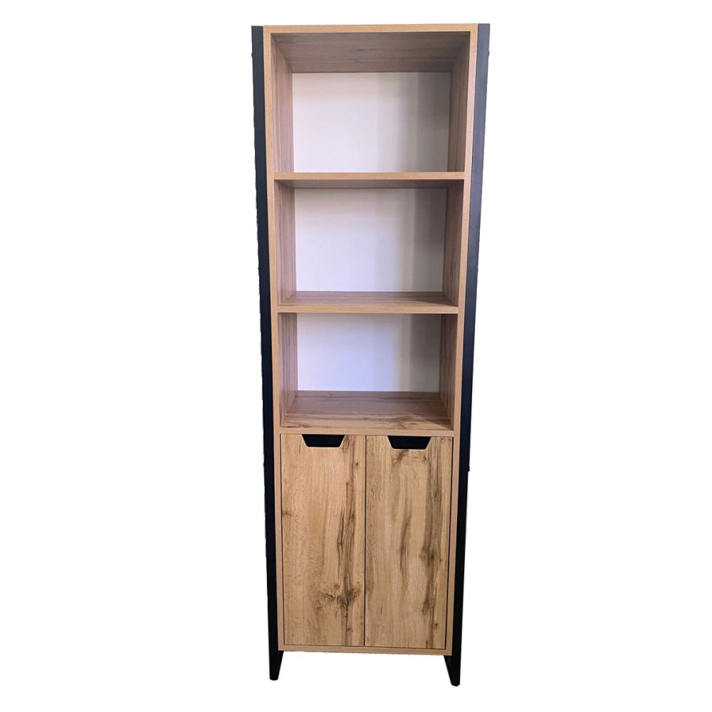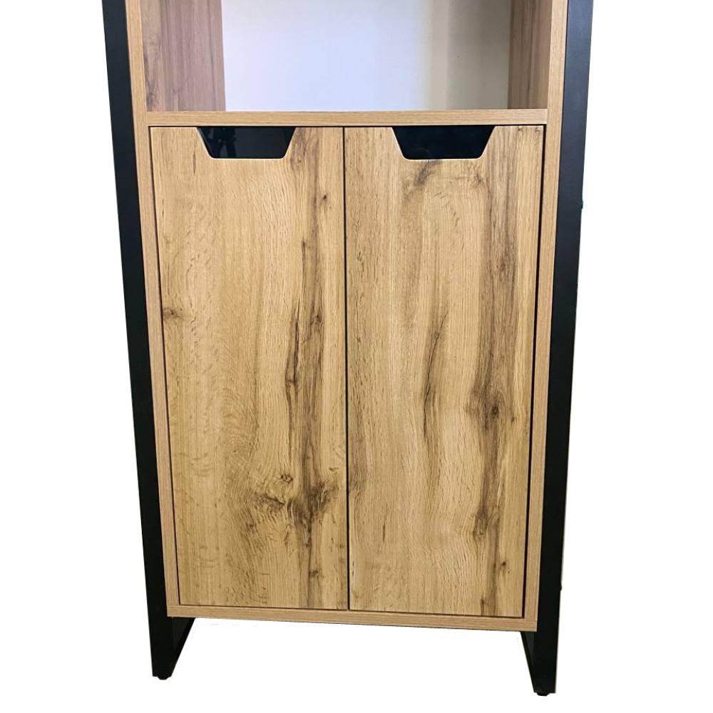 Шафа оснащена трьома відкритими полицями для зручного розміщення документів, книг або декоративних елементів. У нижній частині розташоване відділення з двома дверцятами, яке дозволяє приховати речі та зберігати порядок у приміщенні.