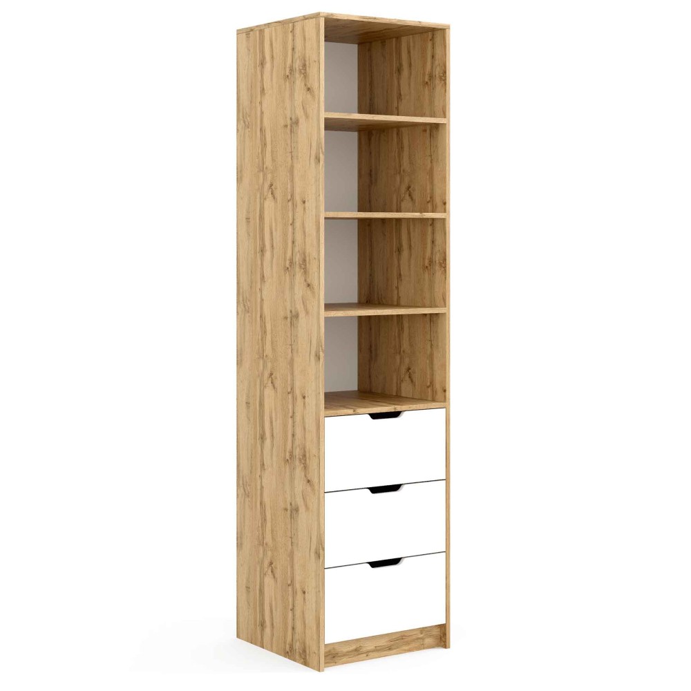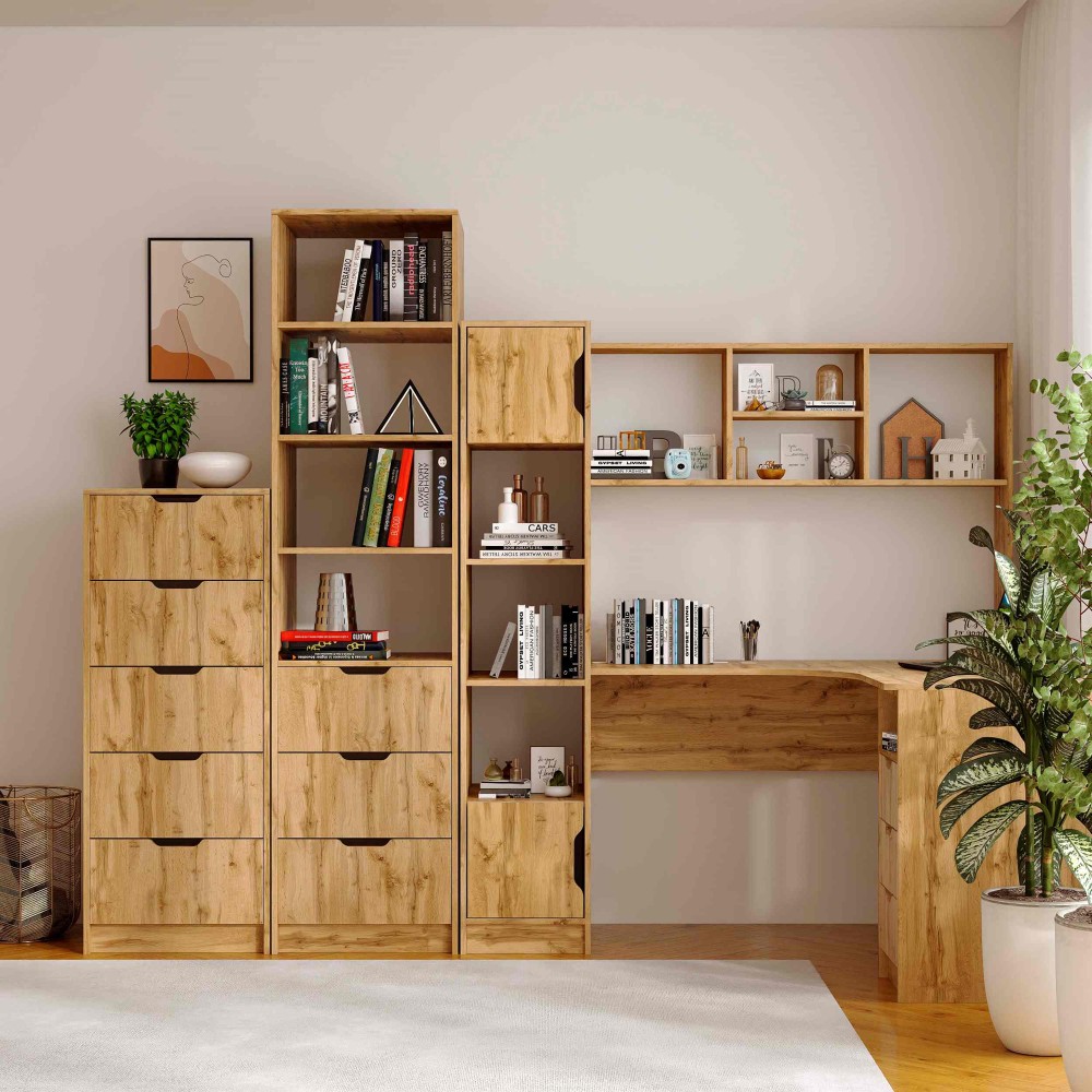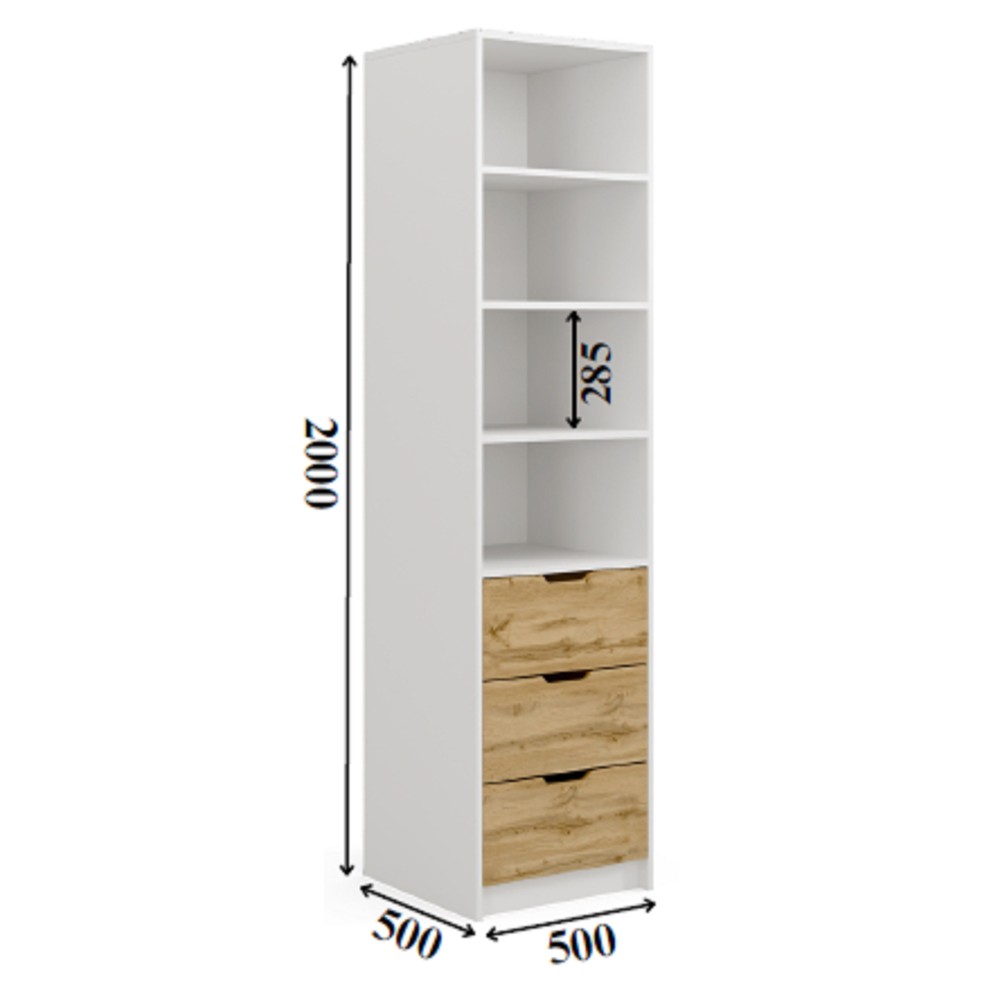 У конструкції передбачено чотири відкриті полиці висотою 285 мм, які ідеально підходять для книг або декору, а також три місткі шухляди на телескопічних направляючих довжиною 400 мм — вони висуваються плавно та забезпечують зручний доступ до вмісту.