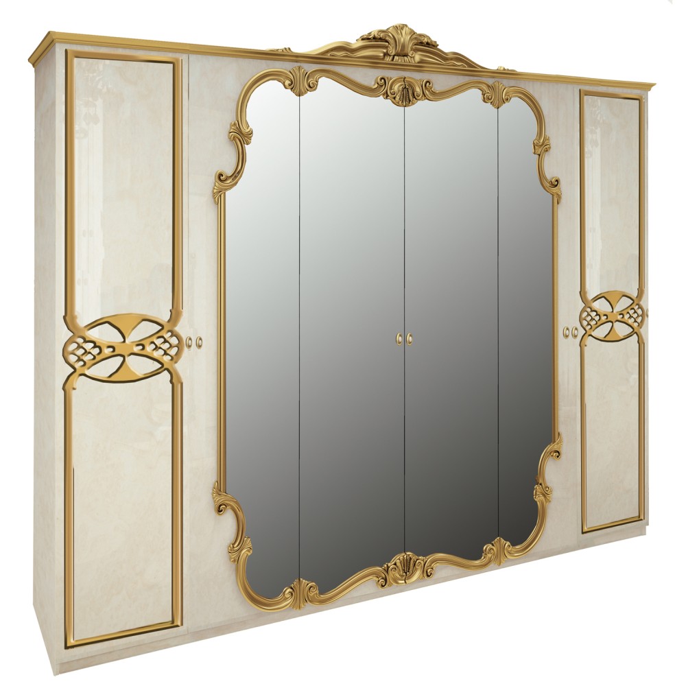 Шафа 6-ти дверна Victoria чудово доповнить ваш розкішний класичний інтер'єр і додасть вишуканості та стилю у ваш будинок. Дзеркала, розташовані на дверях, створюють відчуття додаткового простору. Усередині ви знайдете достатньо місця для акуратного зберігання вашого одягу – штанги для вішалок та полиці для складених речей. Ця шикарна шафа виділяється завдяки декоративним накладним елементам кольору золото, які надають об'ємності меблям. Світлі та ніжні тони у поєднанні із золотом максимально точно передають усю розкіш класичного стилю. Крім того, ви можете доукомплектувати шафу набором із трьох полиць, Т-подібною полицею та тумбою з висувними ящиками.