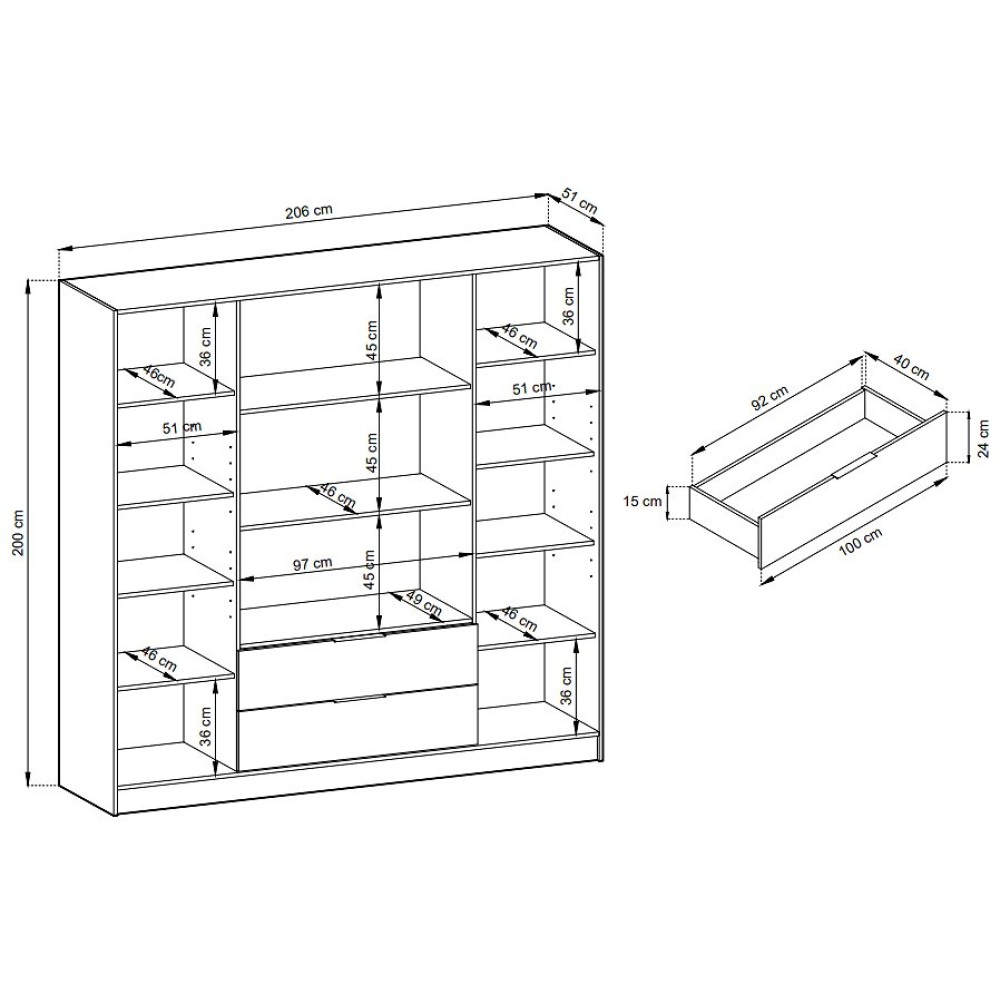 Всередині шафи розташований оптимально організований простір: полиці по всій висоті, які можна регулювати в п'яти положеннях, і два містких висувних ящика на кулькових направляючих, що ідеально підходять для зберігання дрібних предметів, аксесуарів і текстилю. Шафа забезпечить зручний доступ до речей і допоможе підтримувати порядок без зайвих зусиль.