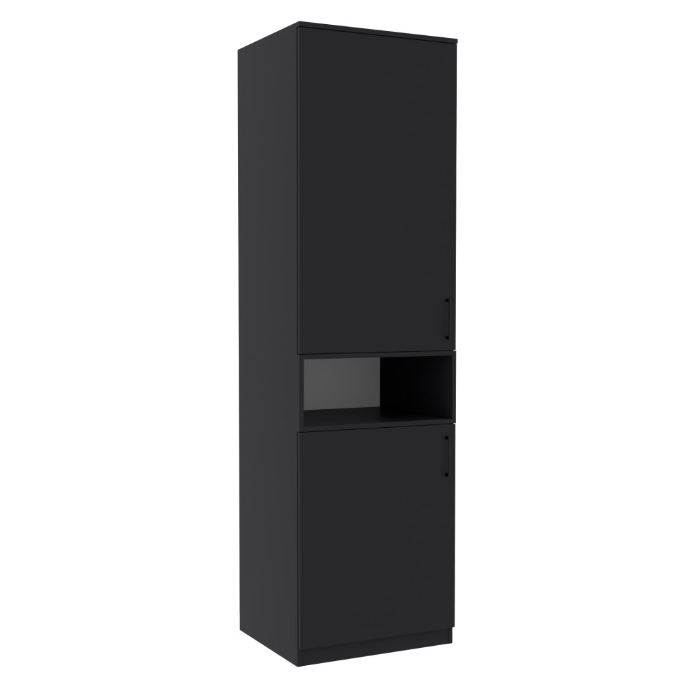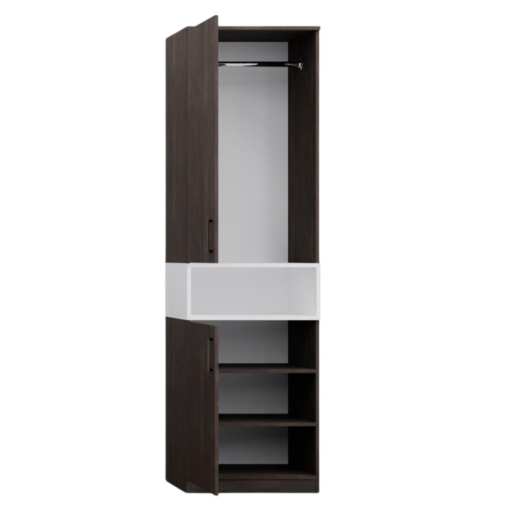 У верхній частині шафи, за дверцятами, розміщена штанга для вішаків, що ідеально підходить для зберігання одягу, який потребує підвішування. Нижня частина оснащена місткими полицями, на яких зручно розмістити складений одяг, коробки, текстиль або інші необхідні речі. Таке планування робить шафу практичною для щоденного використання.