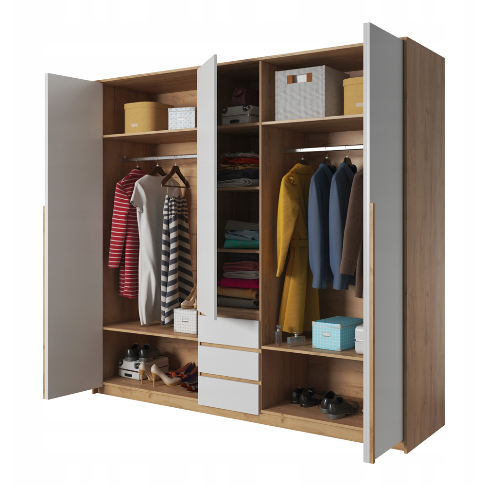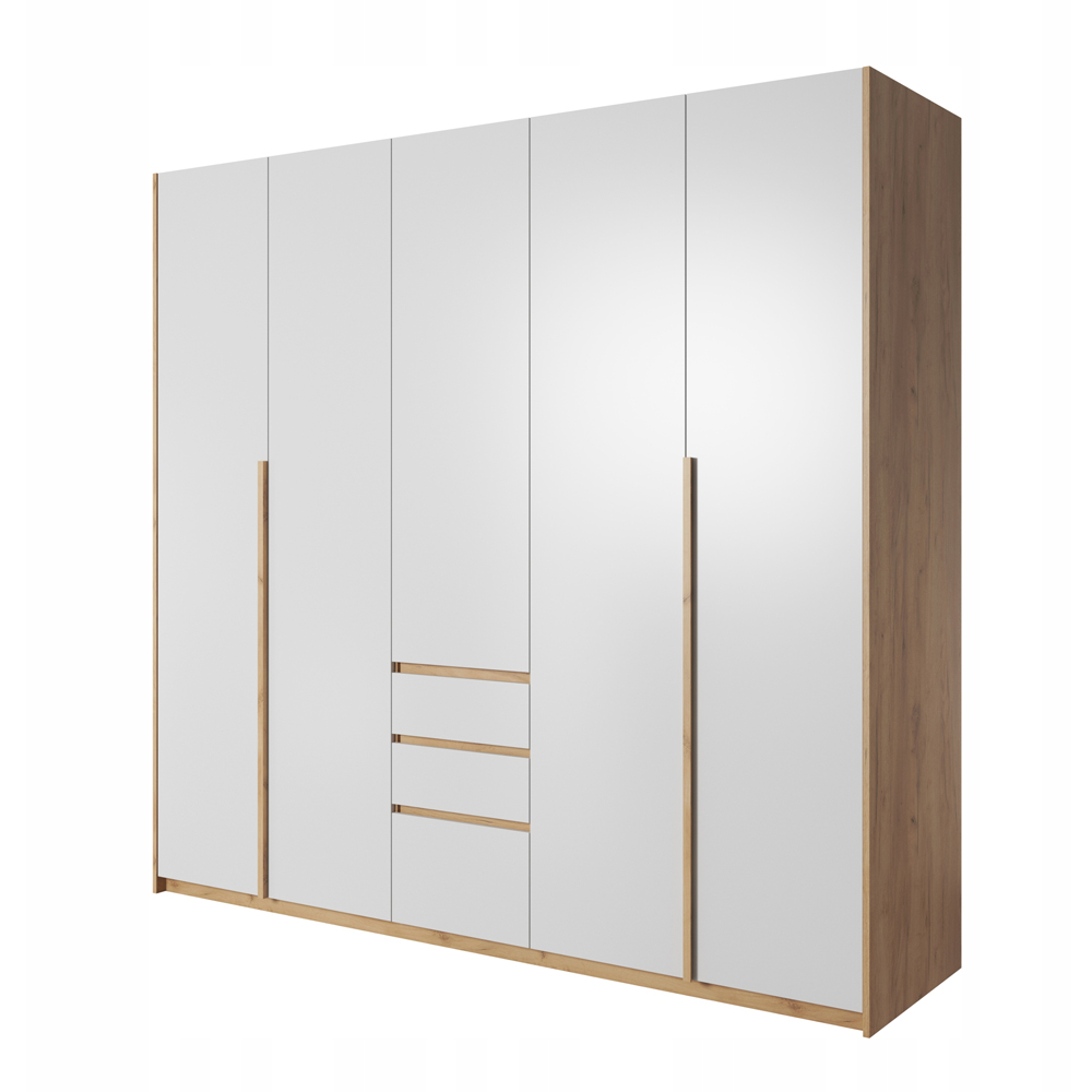 Шафа Helo 5D3S/230 - це сучасне та функціональне рішення для облаштування вашої спальні. Ця шафа забезпечить достатньо місця для організації зберігання всього вашого гардеробу. Білі спокійні тони разом із натуральним дубом допомагають створити чарівну атмосферу в спальні. Бічні відділення мають ідентичне наповнення – широка штанга для вішалок та 2 полиці. У центральній частині знаходяться три висувні ящики і полиці, приховані за дверцятами. Шафа Helo стане чудовим доповненням для вашого простору, забезпечуючи комфорт та стиль.